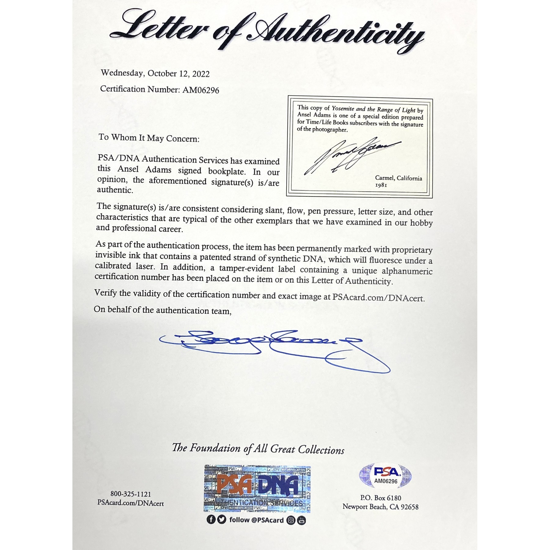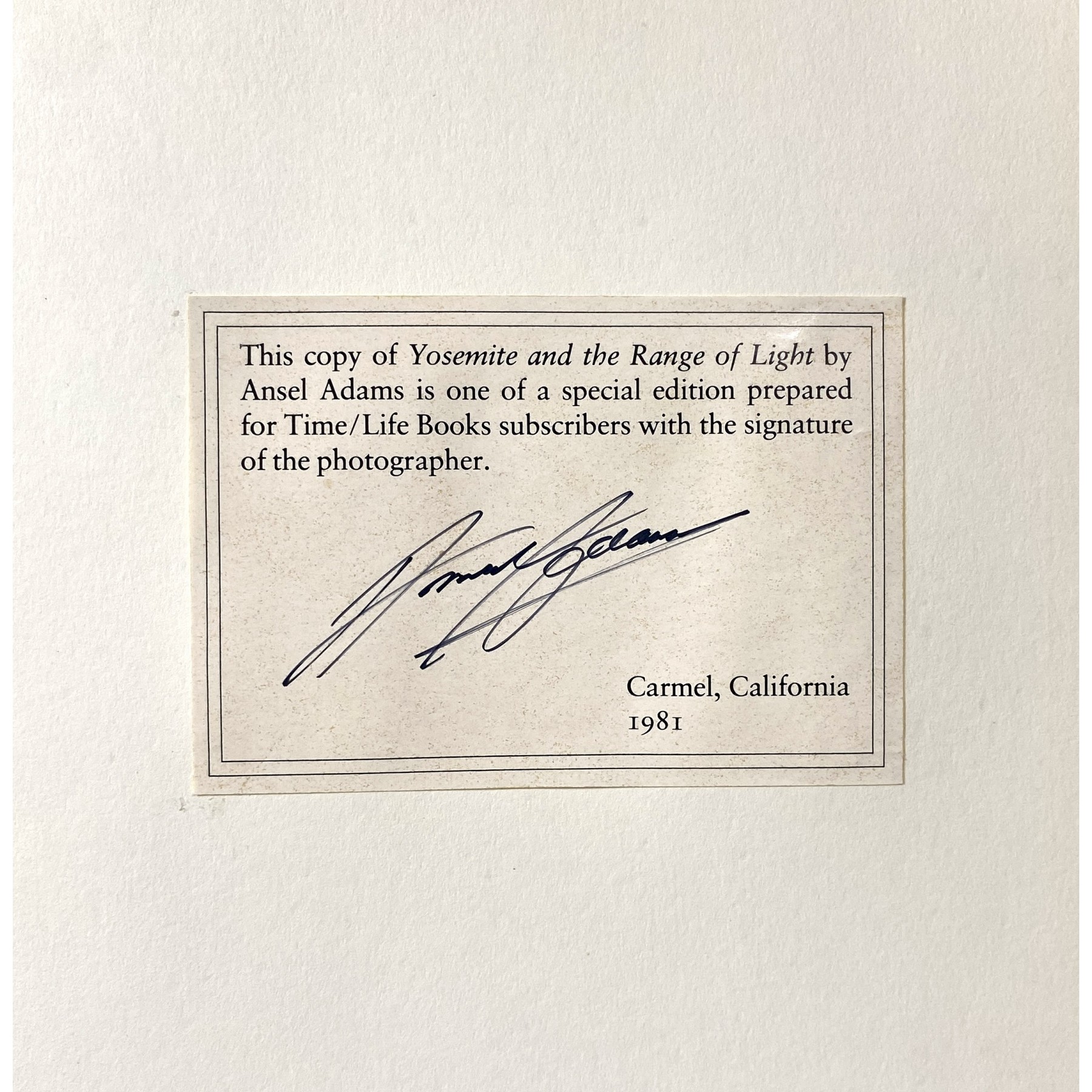 This 1981 special edition, fourth printing of "Yosemite and The Range of Light" by Ansel Adams features 116 of his iconic photographs capturing the majesty of Yosemite Valley and the Sierra Nevada mountains. Boldly signed by Adams on a bookplate affixed to the front free endpaper, this oversized volume (15.25" x 12.25") is housed in its original dust jacket. A defining work from the master of American landscape photography. Includes a PSA/DNA Letter of Authenticity.