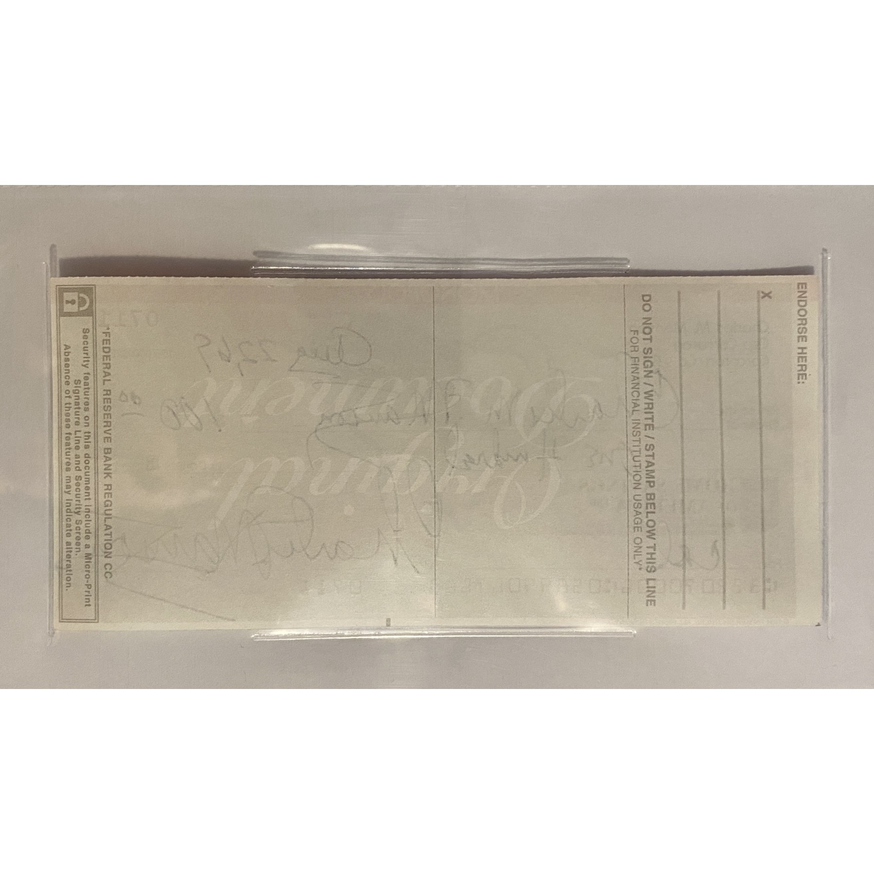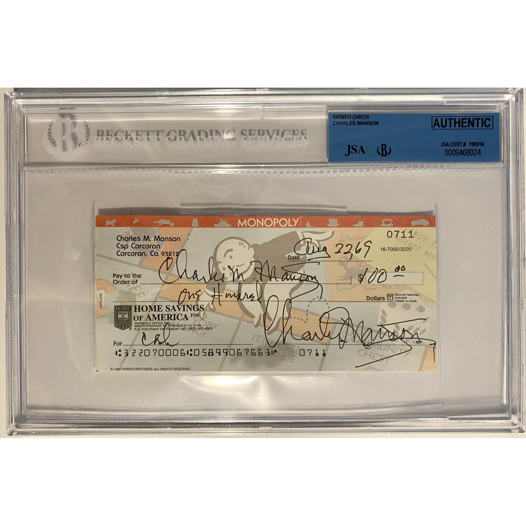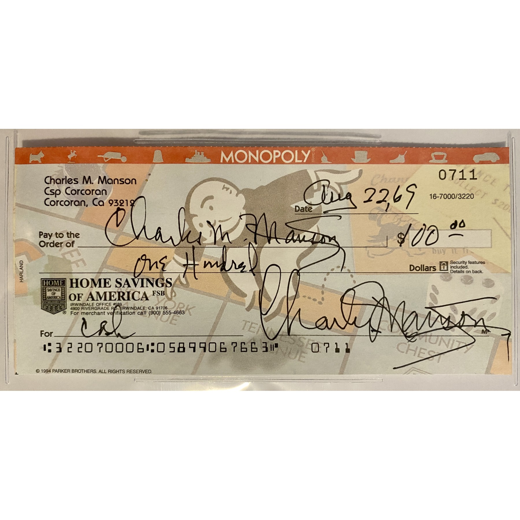 This bank check, signed twice by Charles Manson, was created by a collector who knew & visited Manson for 15 years in prison, taking them into prison during his visits to have them signed. It took five years before Manson agreed to meet with him, & during their friendship, the collector created a legitimate bank account for Charles Manson. A limited amount of checks were signed before the FBI came knocking at his door. The checks were never cashed - dated "Aug 22, 69". However, they were signed in the 1990’s. The checks were filled out for memorabilia purposes & the account was eventually shut down & only a few have come to market.