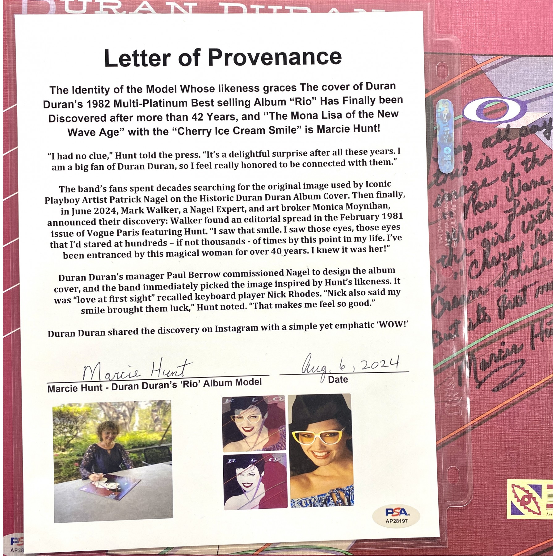 This unique Rio LP by Duran Duran is signed and inscribed by Marcie Hunt, the woman behind the iconic cover art. She writes: "They all say this is the image of the New Wave Mona Lisa or the girl with the Cherry Ice Cream Smile but it's just me!" A captivating nod to her place in pop culture history. PSA authenticated & includes a signed Letter of Provenance confirming her identity as the model and muse. A fusion of music, art, and New Wave nostalgia - perfect for the devoted Duran Duran fan.