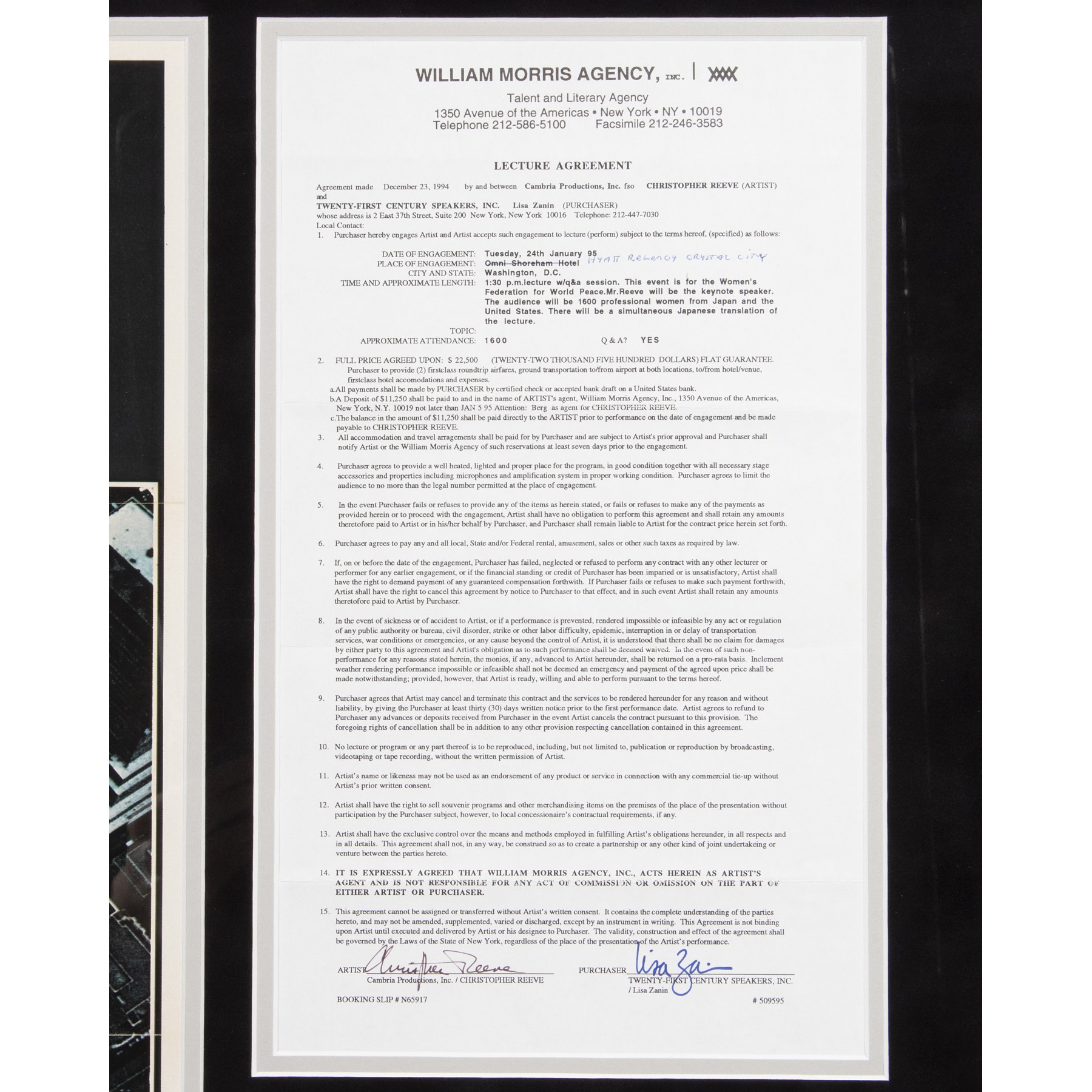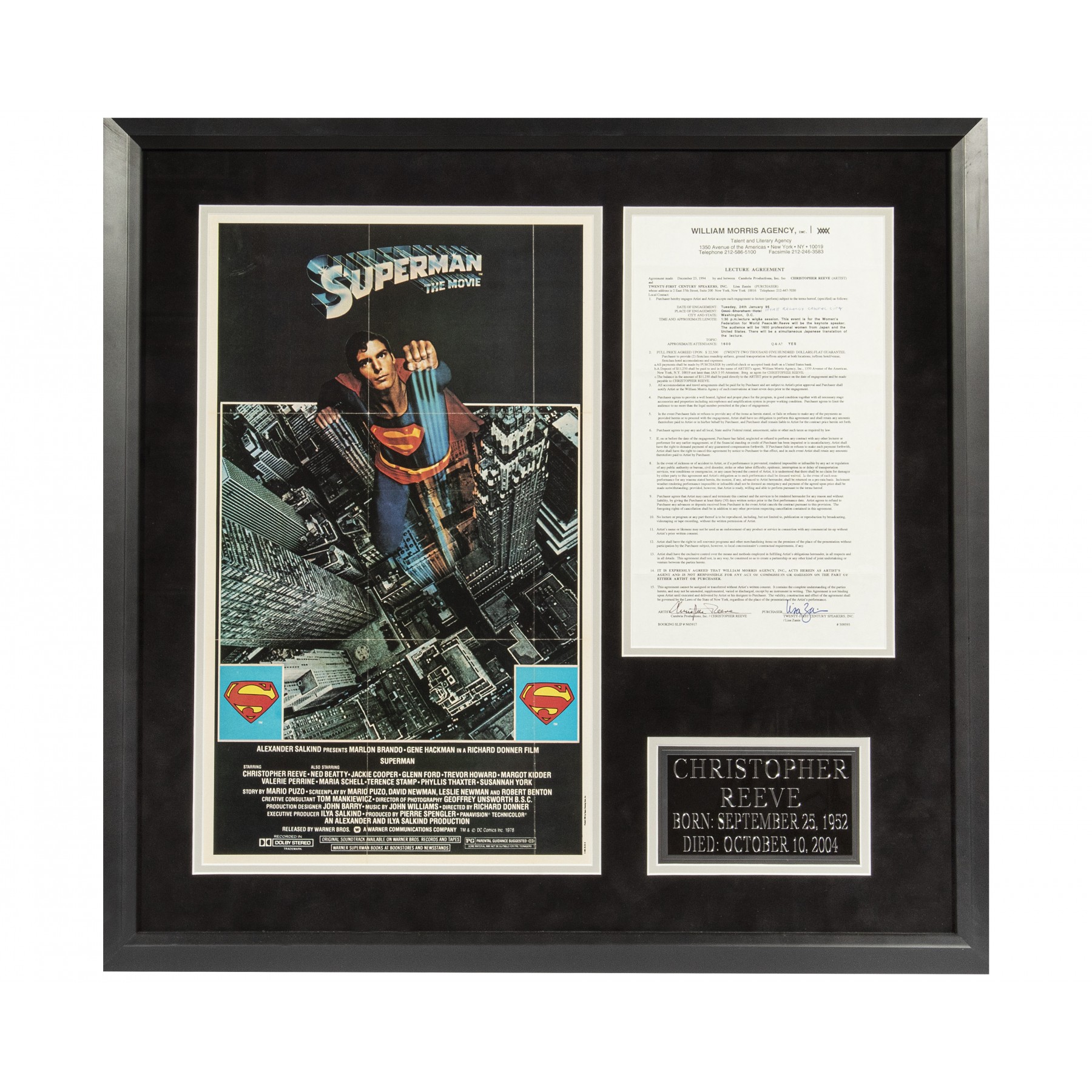 This original William Morris Agency contract dated December 23, 1994, is hand-signed by Christopher Reeve in bold ink, awarded a PSA/DNA auto grade of 9. Framed at 27" x 26", the display also features a vibrant Superman: The Movie poster - an homage to the role that made Reeve a household name. Beyond his iconic portrayal of the Man of Steel, Reeve became a tireless advocate for spinal cord injury research after a life-altering accident in 1995. Comes complete with a PSA/DNA letter of authenticity.