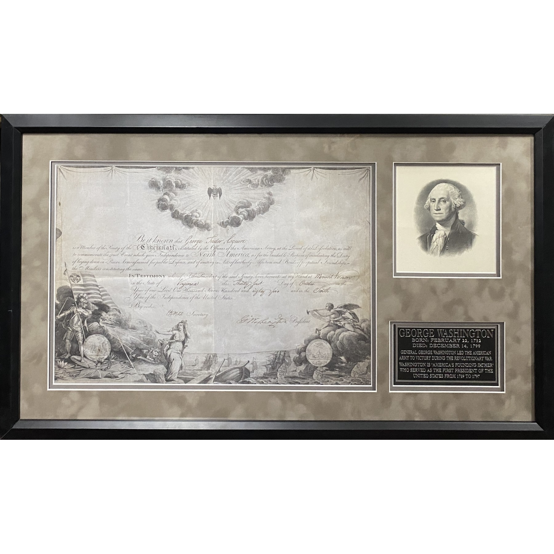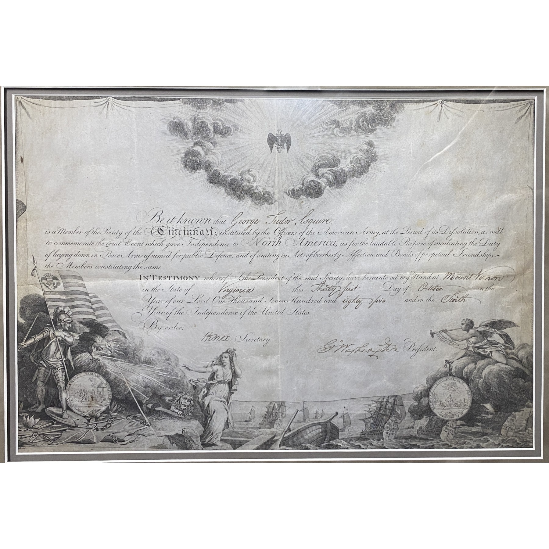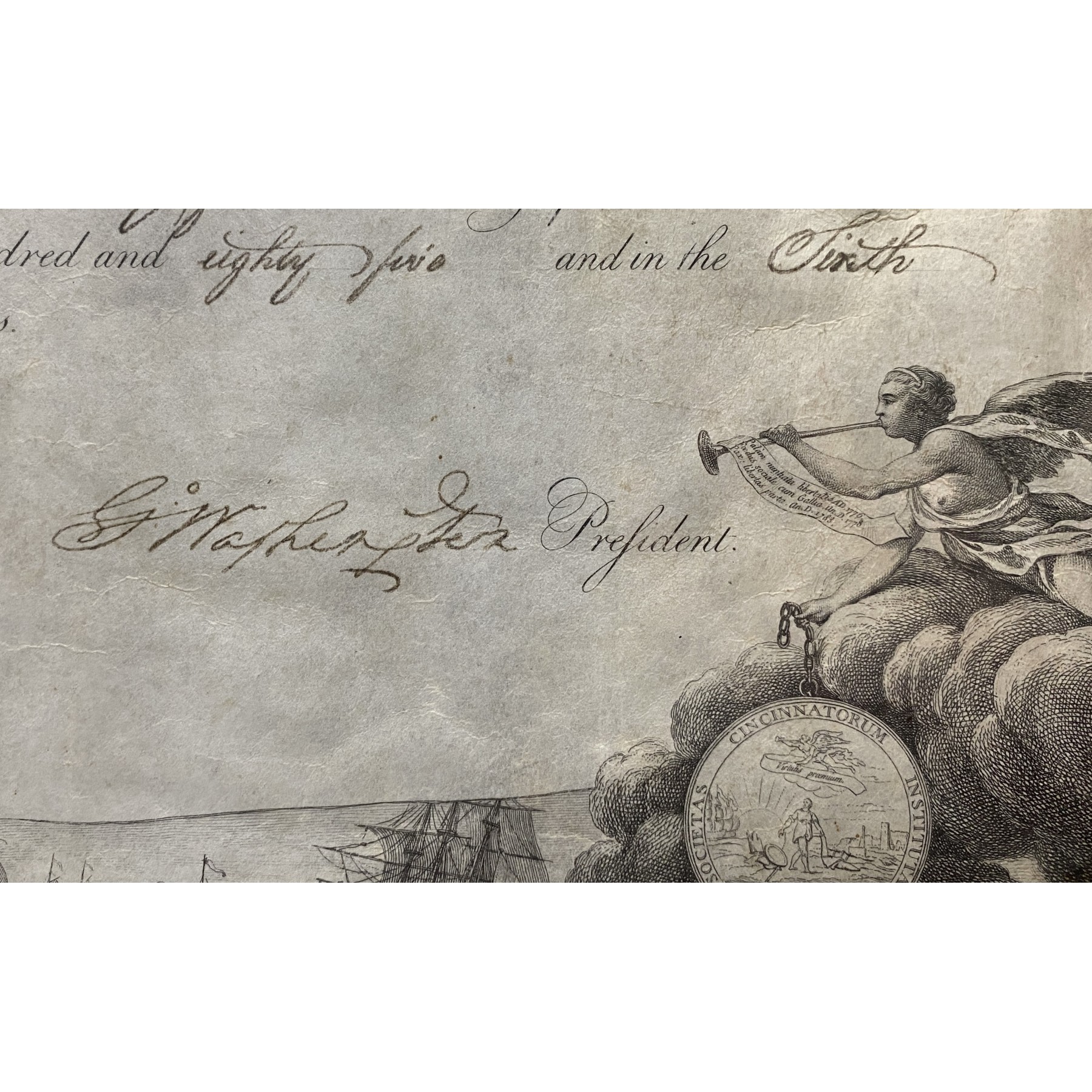 This leaf of parchment, 20.5" x 14" Engraving is signed "Go: Washington", "Aug L. Belle, Del." and countersigned by Henry Knox at Mount Vernon, Virginia on October 31, 1785. Established May 13, 1783 as America's first Military Order, the Society of Cincinnati was originally composed of members of the Continental Army serving at the cantonment on the Hudson River. At the close of the Revolutionary War, these men established the Society as a tribute to the brotherhood that had been born of their time serving in battle together and to honor the freedom they had fought so hard for. The name honors an illustrious Roman General, Lucius Quintus Cincinnatus, who left his home and family twice in his life to lead the Roman Army to victory, and both times eschewed further honors. Members of the society sought to emulate Cincinnatus, both in war and peace. It was these same men who unanimously selected General George Washington as the leader of his fledgling country for his honor, valor, and wisdom displayed strongly in the course of the war in the spirit of their namesake hero.