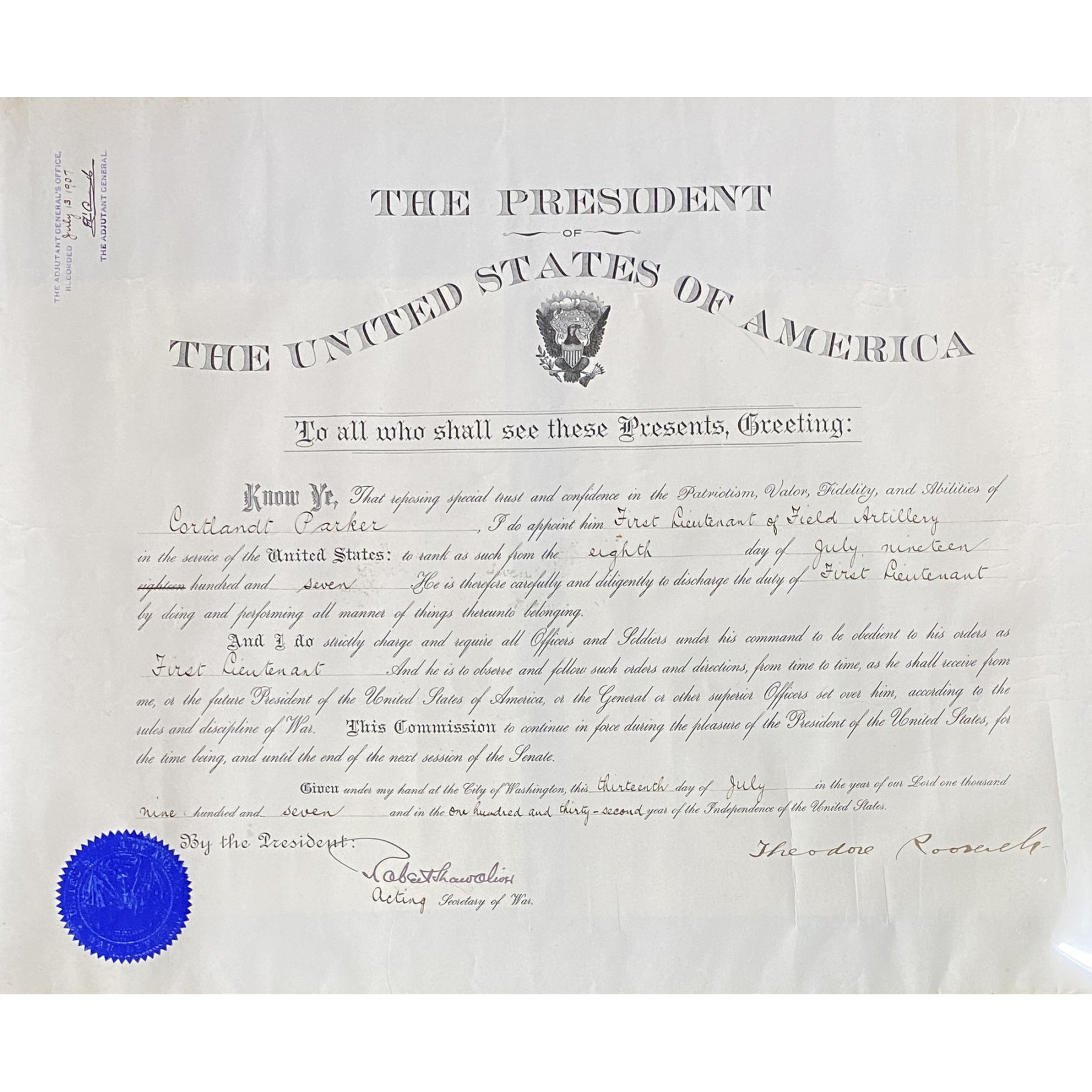 This Theodore Roosevelt military document was boldly signed in black fountain pen as President, appointing Cortlandt Parker as First Lieutenant in the Artillery Corps on July 13, 1907. Boldly signed "Theodore Roosevelt" at lower right, also signed by Robert Shaw Oliver as Acting Secretary of War. With intact blue paper seal. Document measures 19” X. 16”. Includes PSA Letter of Authenticity with an PSA autograph grade of NM 8.