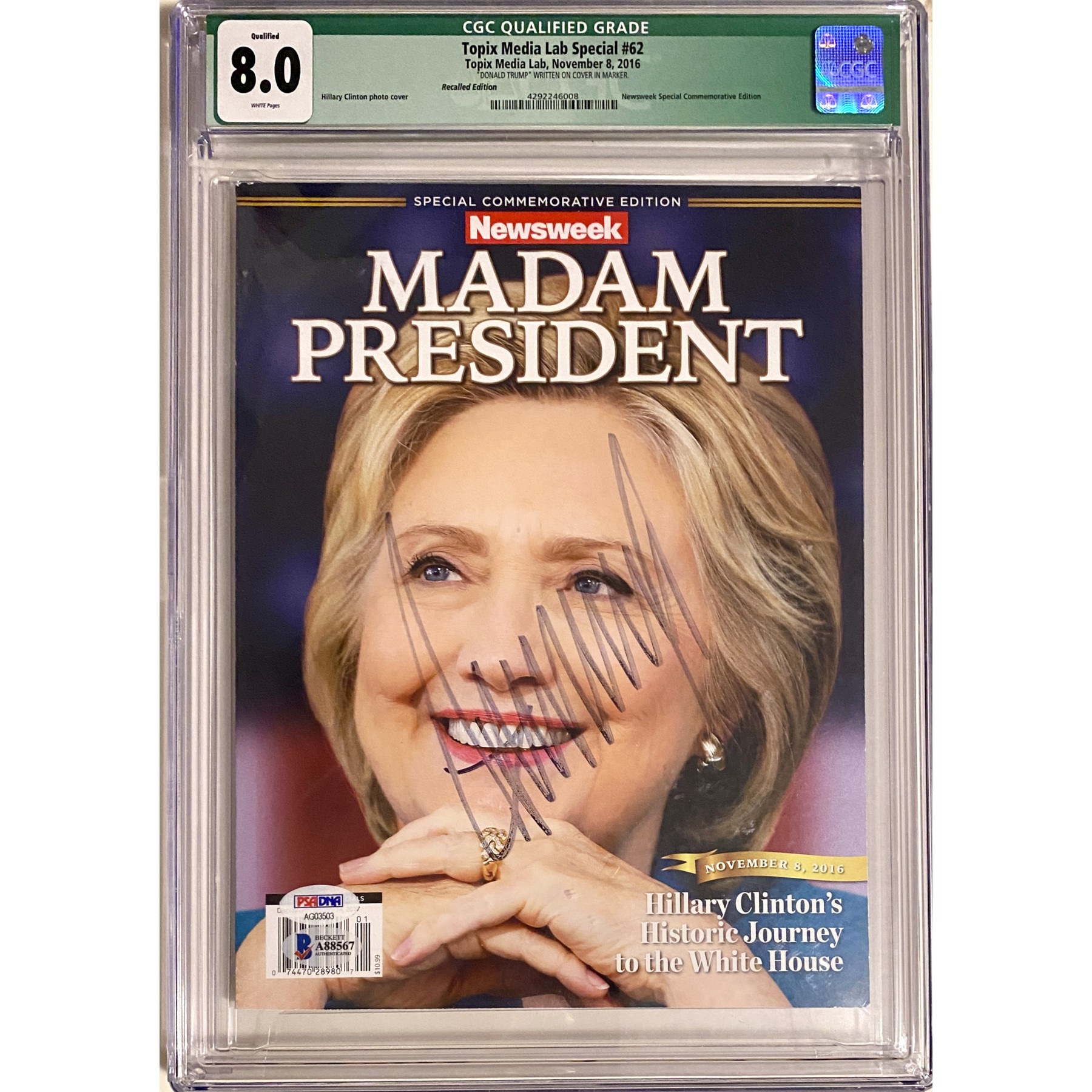 This copy is signed boldly in black felt tip by President Donald Trump, CGC encapsulated with a grade of 8. Comes complete with both PSA & Beckett letters of authenticity. A striking addition to any political collection, and a reminder to never celebrate too early.