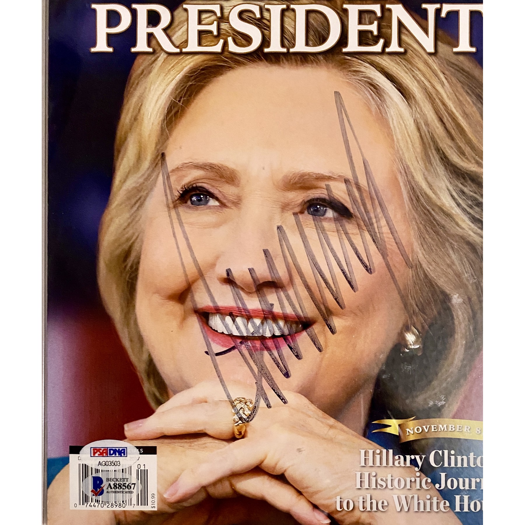 What makes this historically inaccurate "Madam President" magazine even more exceptional is the fact that President Donald Trump himself signed it the morning after the election. The consigner notes that she attended a Trump victory celebration the day after the election & held up the magazine which Trump immediately noticed & reached for, then Trump held it up to the crowd and said "Will you take a look at that? Hillary Clinton, Madam President? FAKE NEWS!" And while the crowd was roaring with laughter, Donald Trump signed this now one-of-a-kind magazine & returned it to the happy Republican supporter.