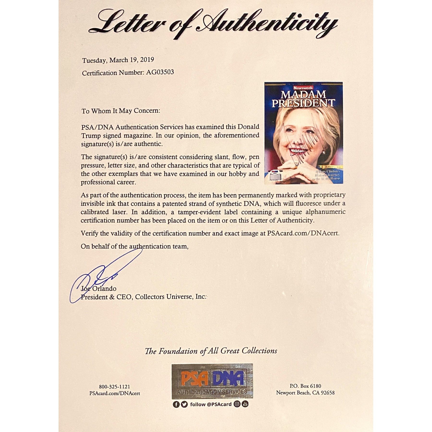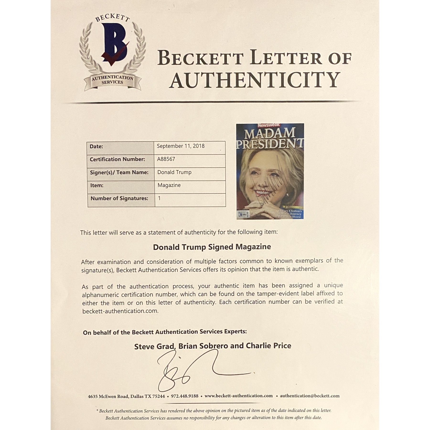 Item #0531 Donald Trump Signed 2016 Newsweek "Madam President" Special Issue - PSA
