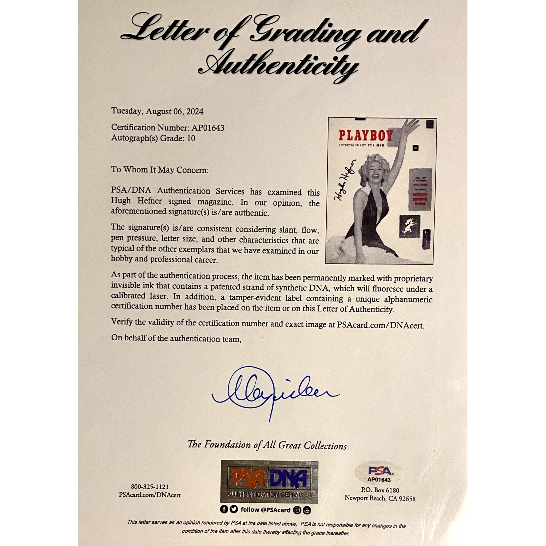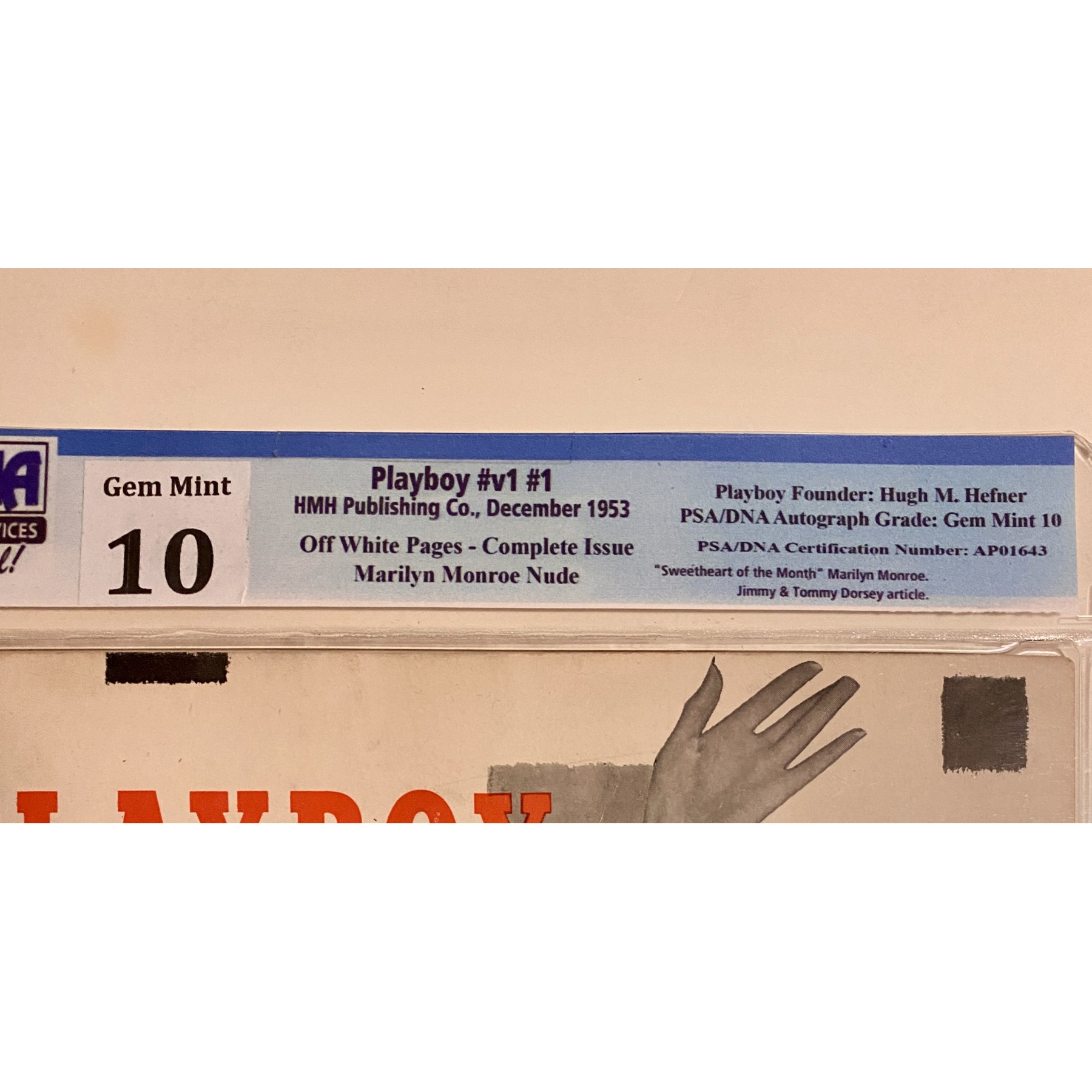 This complete and original 1953 first issue of Playboy is boldly signed on the cover in black felt tip by founder Hugh Hefner. PSA has encapsulated the piece with a perfect GEM MINT 10 autograph grade. This historic debut issue features Marilyn Monroe and launched an empire that would redefine pop culture. Includes a full PSA/DNA letter of authenticity and a letter of provenance from 2011 Playmate of the Year Claire Sinclair.