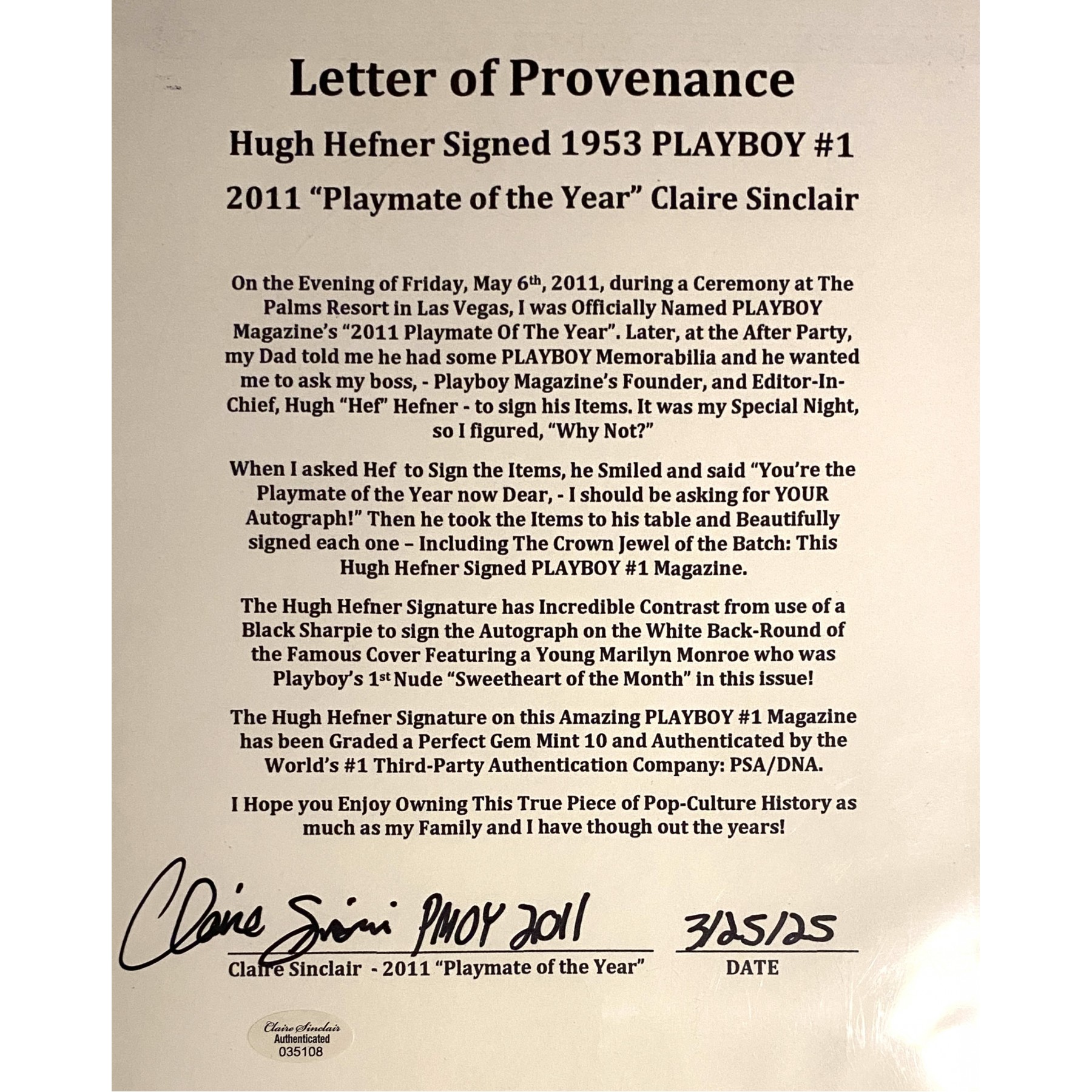 Item #0532 Hugh Hefner Signed 1953 Playboy Issue No. 1 – PSA GEM MINT 10 with Claire Sinclair Provenance
