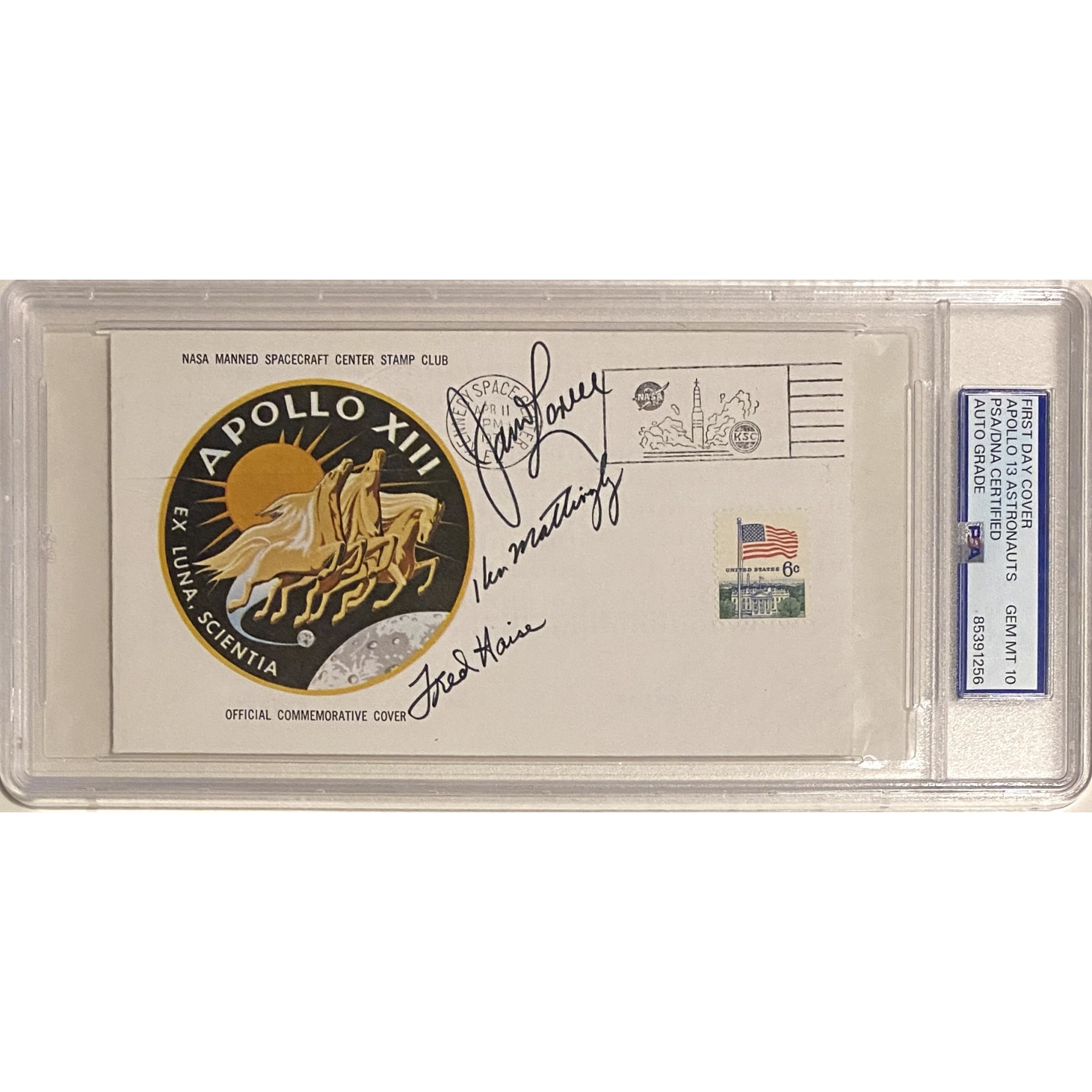 Item #0536 Apollo 13 Insurance Cover Signed by Haise, Lovell & Mattingly – PSA GEM MINT 10
