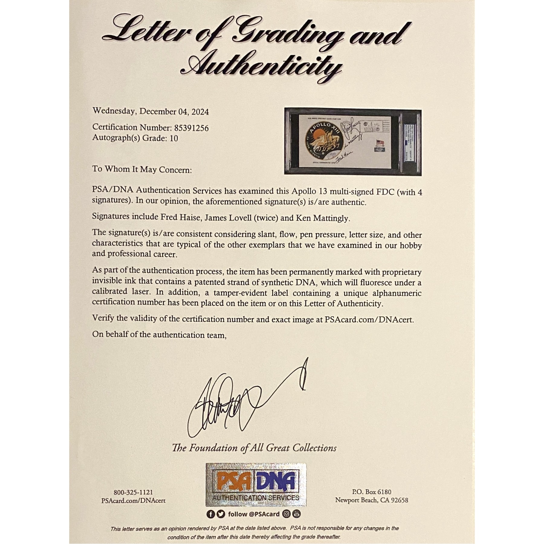 This insurance cover is boldly signed in black ink by crew members Fred Haise, Ken Mattingly, and twice by Commander James Lovell. PSA has encapsulated the piece with a perfect PSA GEM MINT 10 autograph grade. A PSA/DNA Letter of Authenticity is included, along with a crew photo. This piece originates from James Lovell's personal collection, noted & signed on the reverse of the envelope.