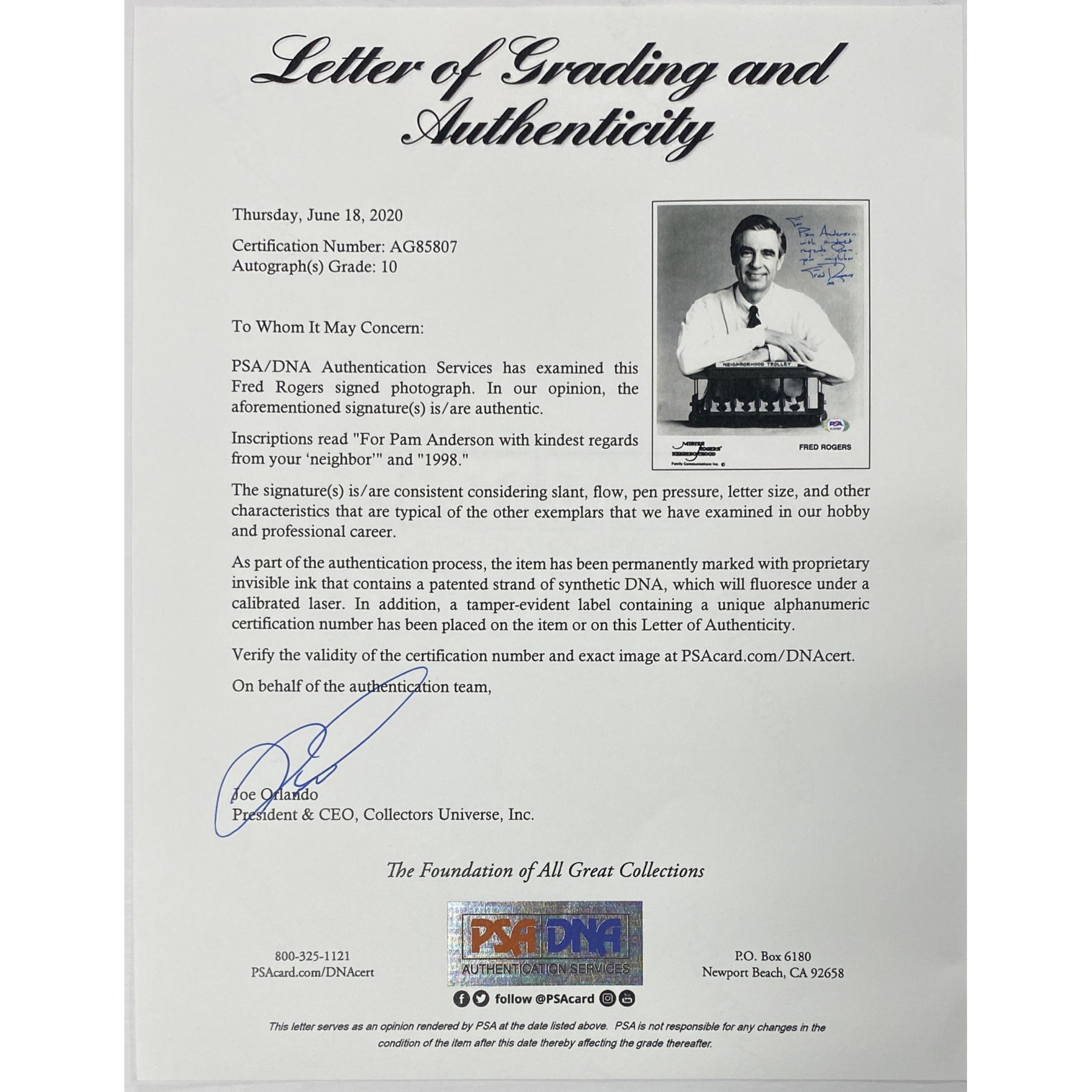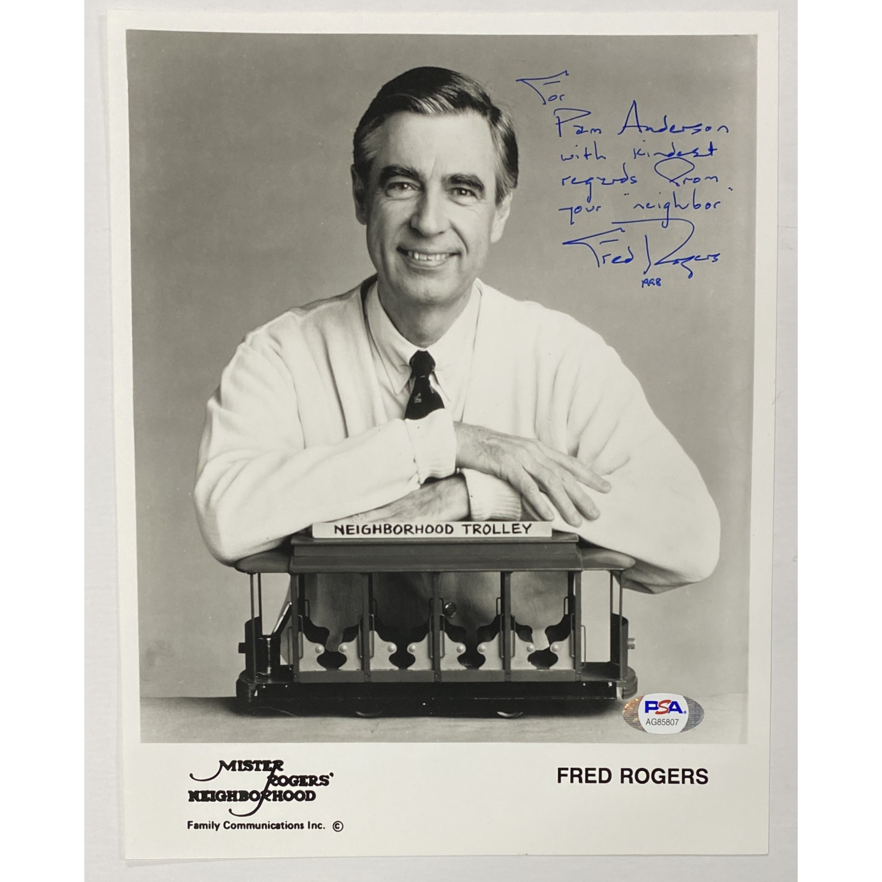 Unique pairing featuring an 8x10 photo signed and inscribed by Fred Rogers of Mister Rogers’ Neighborhood to actress Pamela Anderson: “For Pam Anderson, with kindest regards from your ‘neighbor.’” Boldly signed in blue ink and accompanied by a PSA/DNA Letter of Authenticity. Also included is an 8x10 photo signed by Pamela Anderson in blue ink, with PSA COA. Rogers, beloved for his gentle wisdom and decades of work on children’s television, became a cultural icon of kindness and empathy. An extraordinary crossover of two very different pop culture figures in one remarkable set.