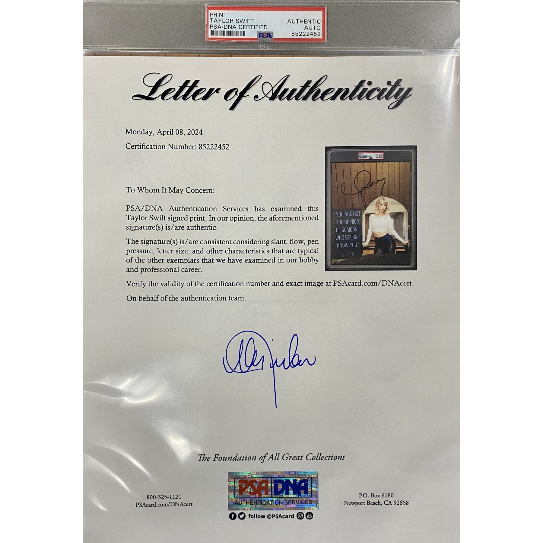 This adorable artist rendition 8.5" x 11" photo is boldly signed by Taylor Swift, one of the most influential artists of her generation. This extremely rare signed image is 1 of only 10 produced. Signed in black marker, it showcases her signature, a photo, & a quote attributed to Swift. Comes encapsulated & accompanied by a PSA/DNA Letter of Authenticity.