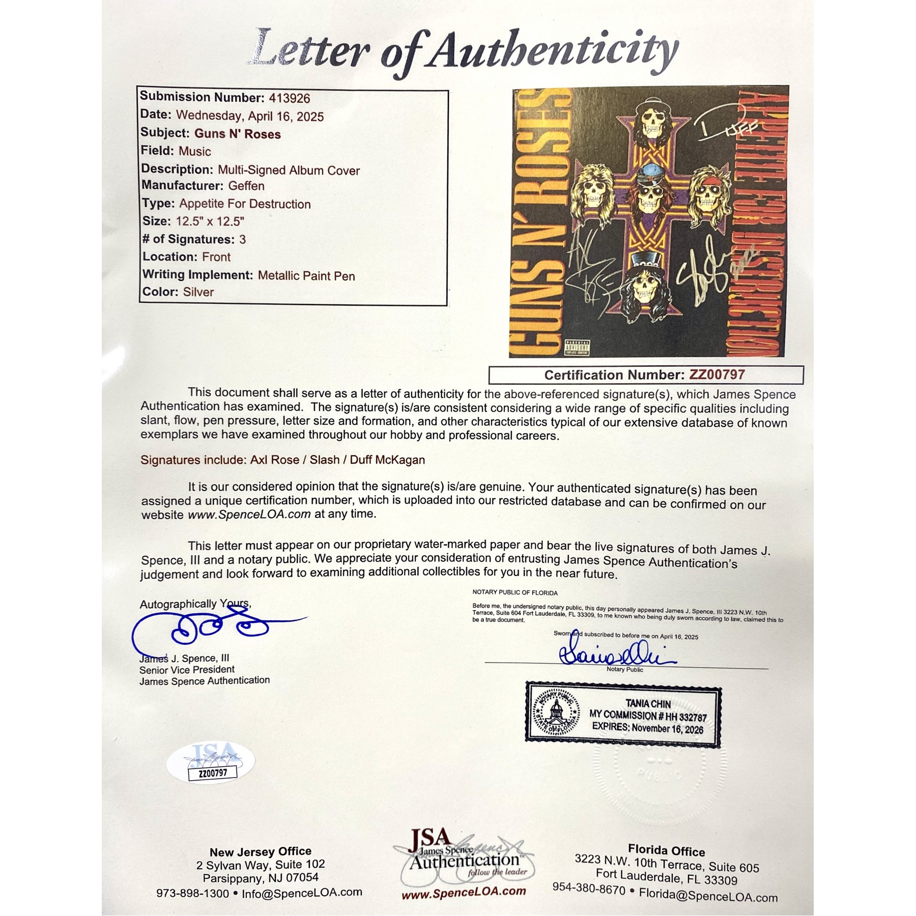Straight from the Sunset Strip, this Guns N' Roses “Appetite for Destruction” LP is boldly signed by rock icons Axl Rose, Slash, and Duff McKagan. This album captures the raw energy of the band on their best-selling debut LP - an essential piece of rock ‘n’ roll history. Comes complete with a full JSA Certificate of Authenticity. Record included.