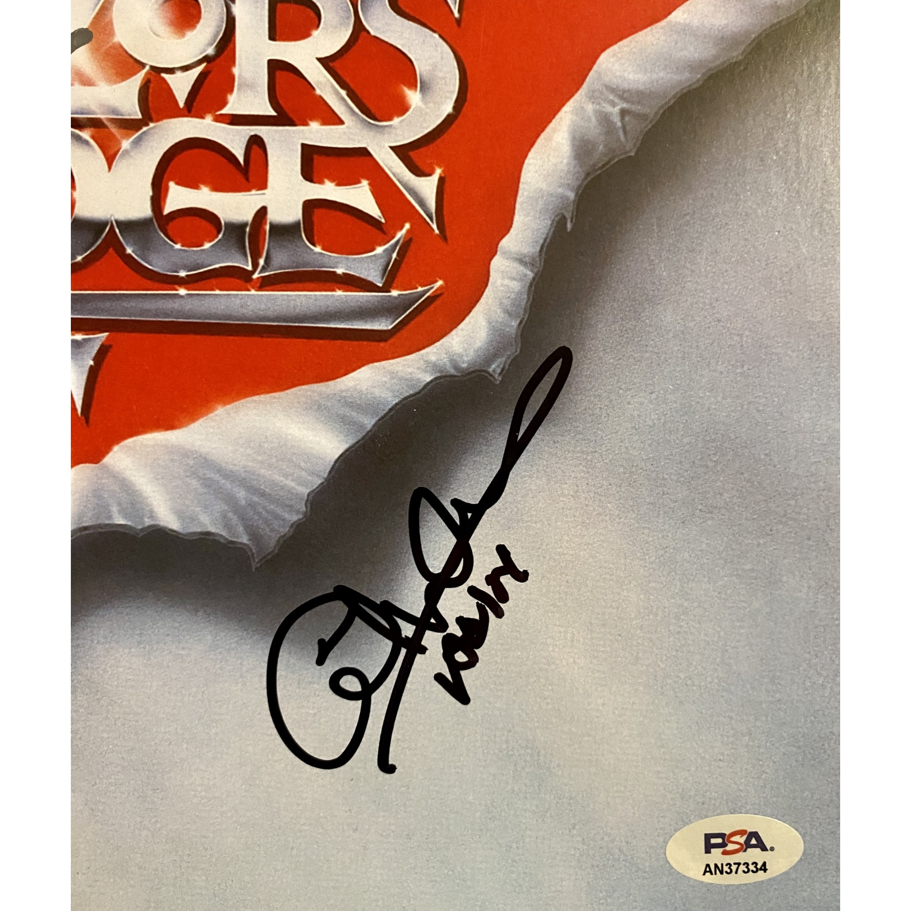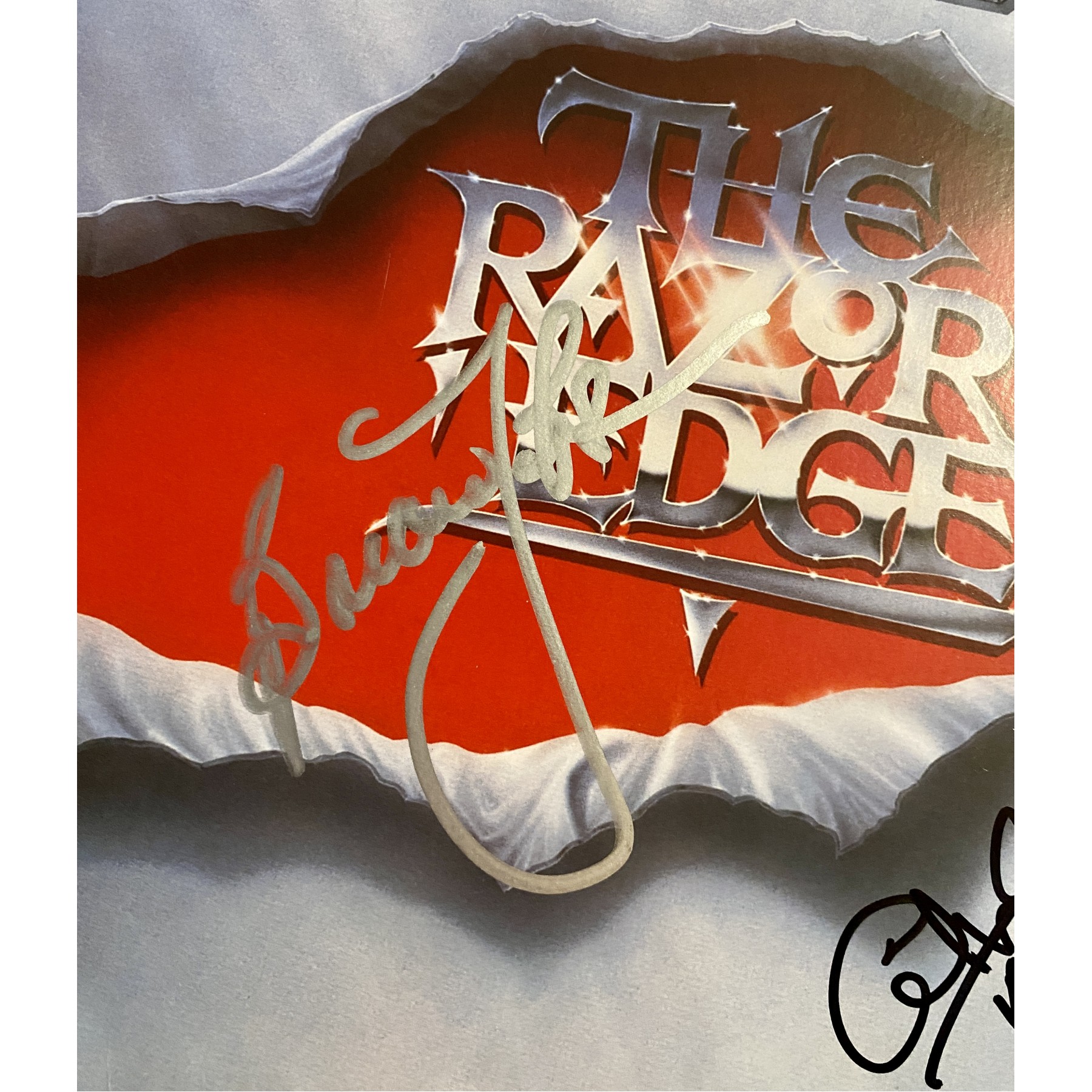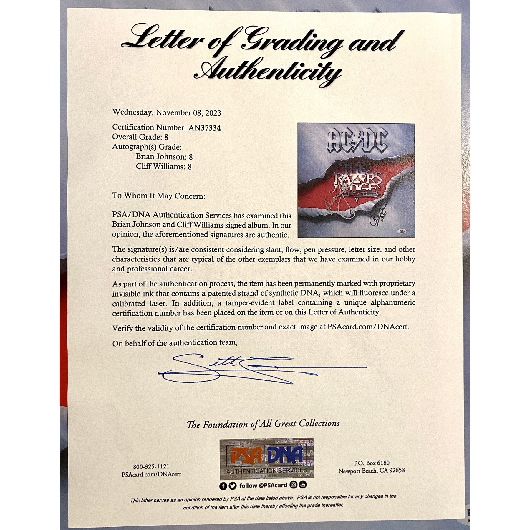 Presented is a high-voltage copy of AC/DC’s "The Razors Edge" LP, signed boldly by singer Brian Johnson in silver felt tip and bassist Cliff Williams in black felt tip. Both autographs have received PSA/DNA auto grades of 8 and come with a full PSA/DNA letter of authenticity. Released in 1990, The Razors Edge marked a triumphant return for the band, featuring the thunderous anthem “Thunderstruck” and reaffirming their place atop the rock world.