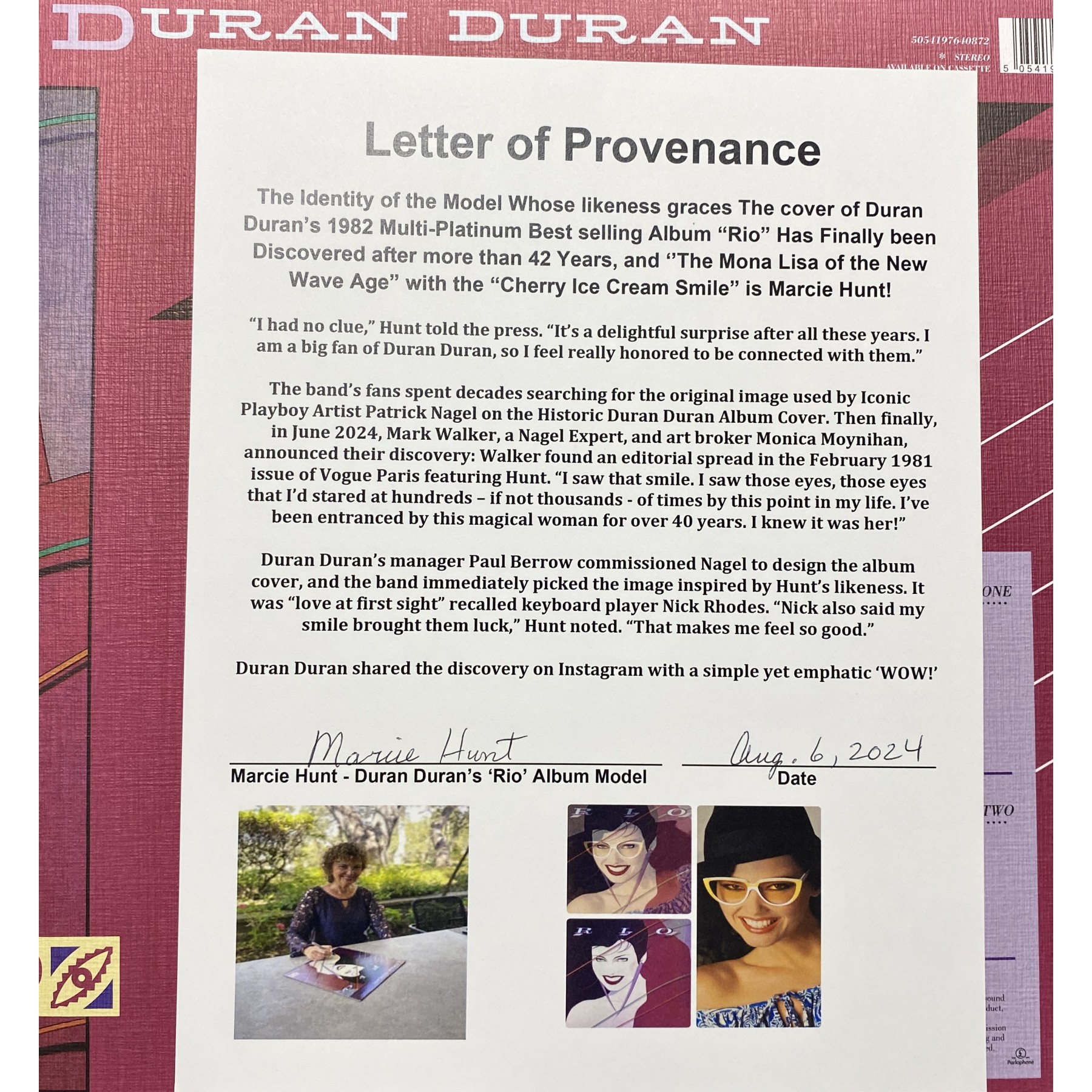 This unique Rio LP by Duran Duran is signed and inscribed by Marcie Hunt, the woman behind Playboy artist Patrick Nagel's iconic cover art. She writes: "They all say this is the image of the New Wave Mona Lisa or the girl with the Cherry Ice Cream Smile but it's just me!" A captivating nod to her place in pop culture history. Authenticated by PSA & includes a signed Letter of Provenance confirming her identity as the model and muse. A fusion of music, art, and New Wave nostalgia - perfect for the devoted Duran Duran fan.