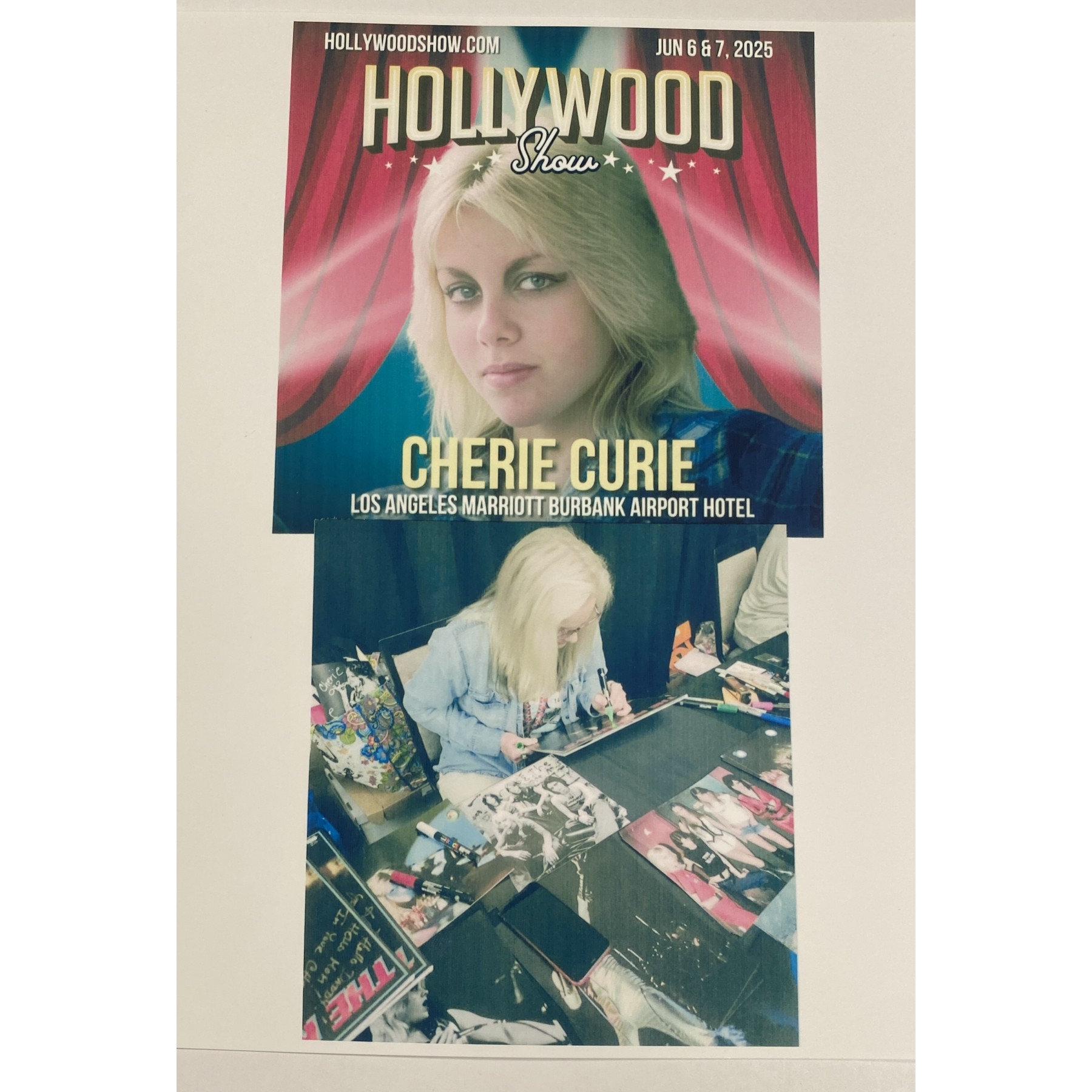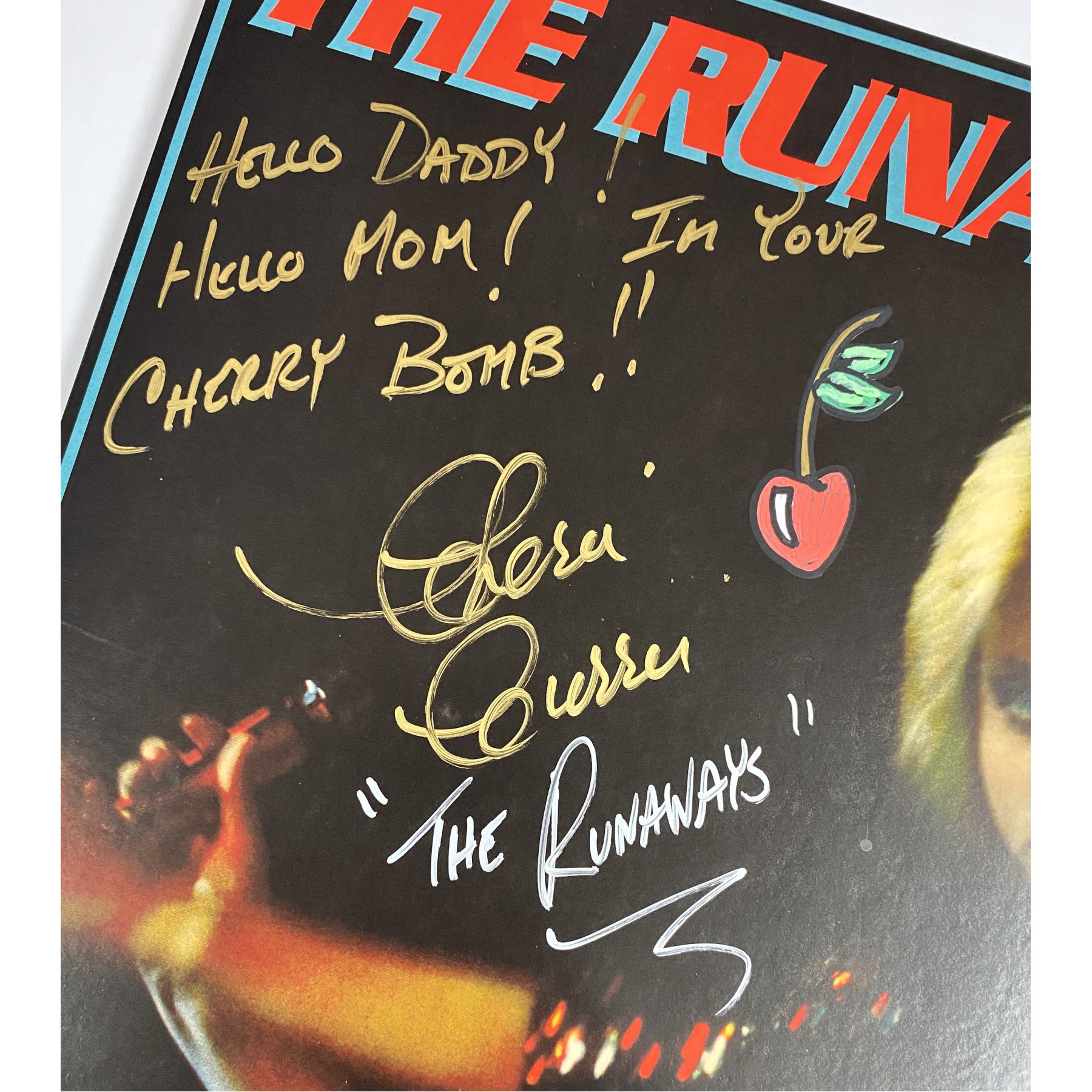 This "The Runaways" LP was signed on the front cover in bold gold ink by singer Cherie Currie, featuring her iconic inscription: "Hello Daddy! Hello Mom! I'm your Cherry Bomb!" along with original hand-drawn cherry art. Includes JSA certification. Currie was the explosive lead singer of The Runaways, the groundbreaking all-female rock band that stormed the 1970s with raw energy and attitude.