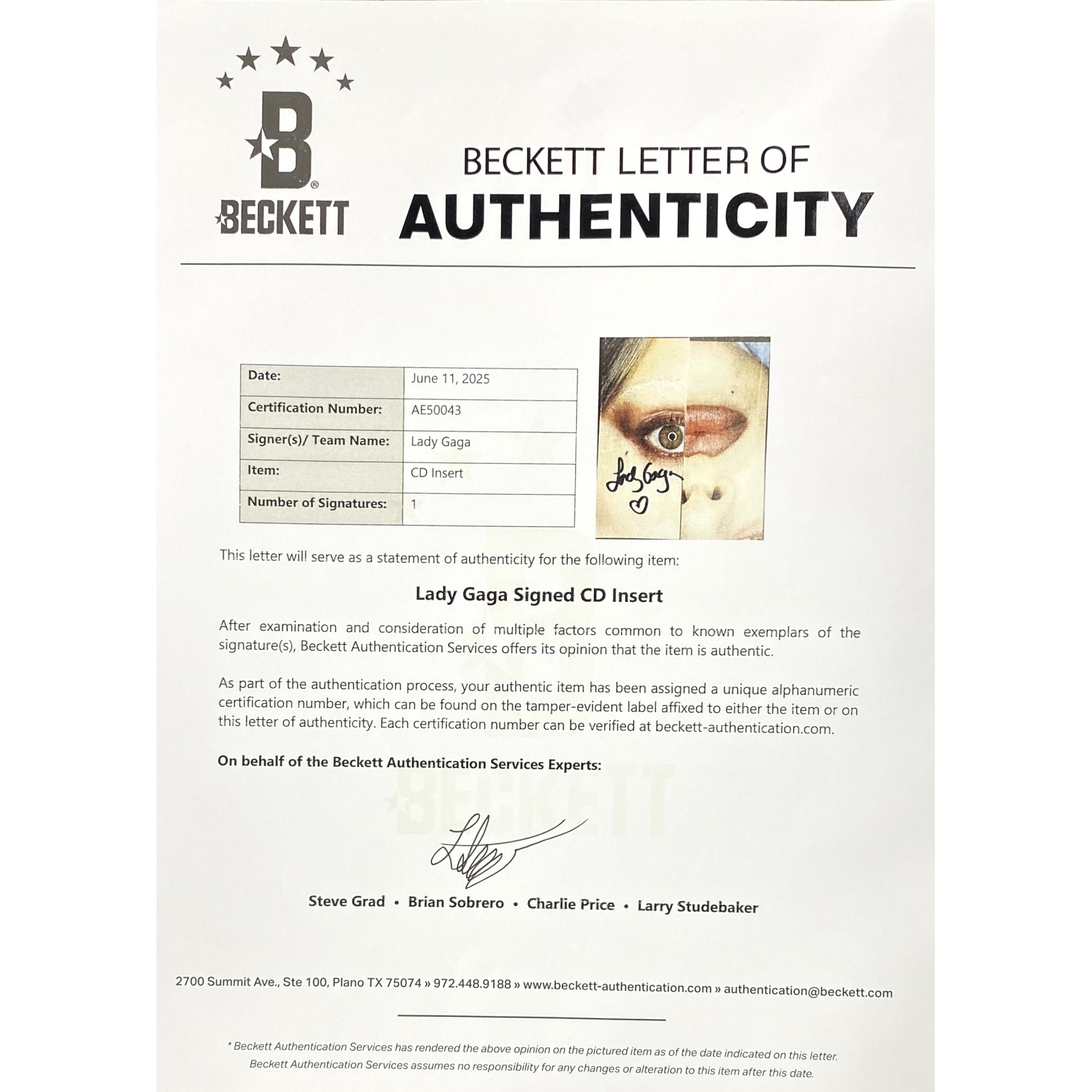 This 11"x11" promotional piece for Lady Gaga’s “Mayhem” LP is boldly signed in black felt tip by the pop icon herself. The signature is clean and vibrant, making it a stunning display centerpiece. Comes complete with a JSA certificate of authenticity & a Beckett letter of authenticity.