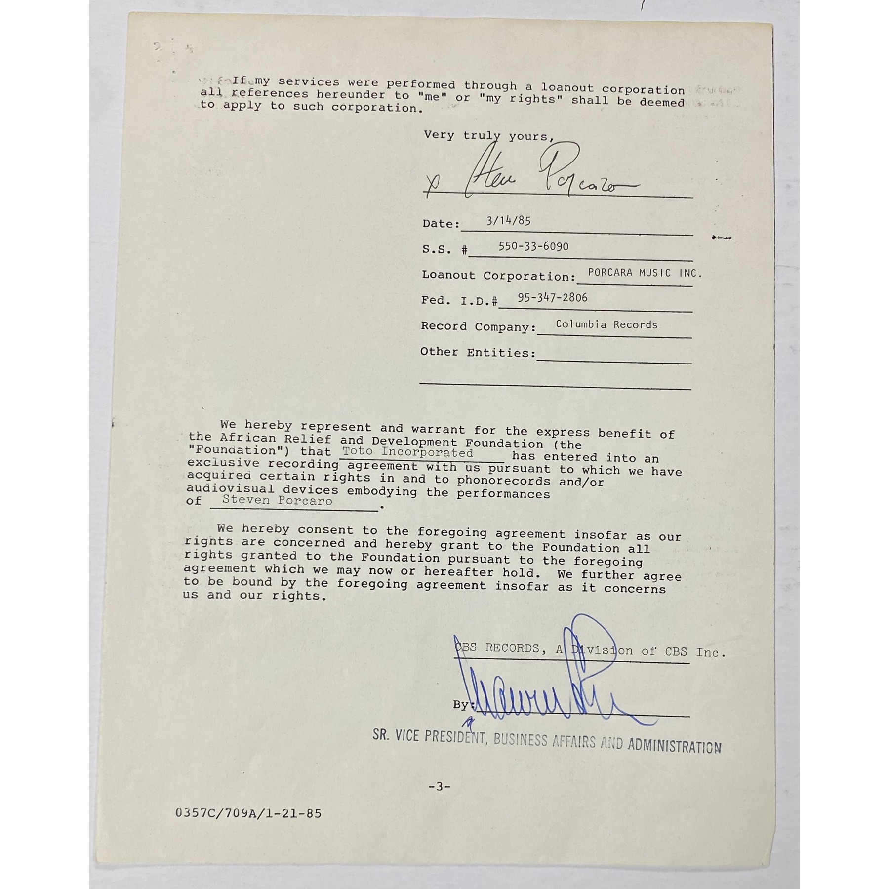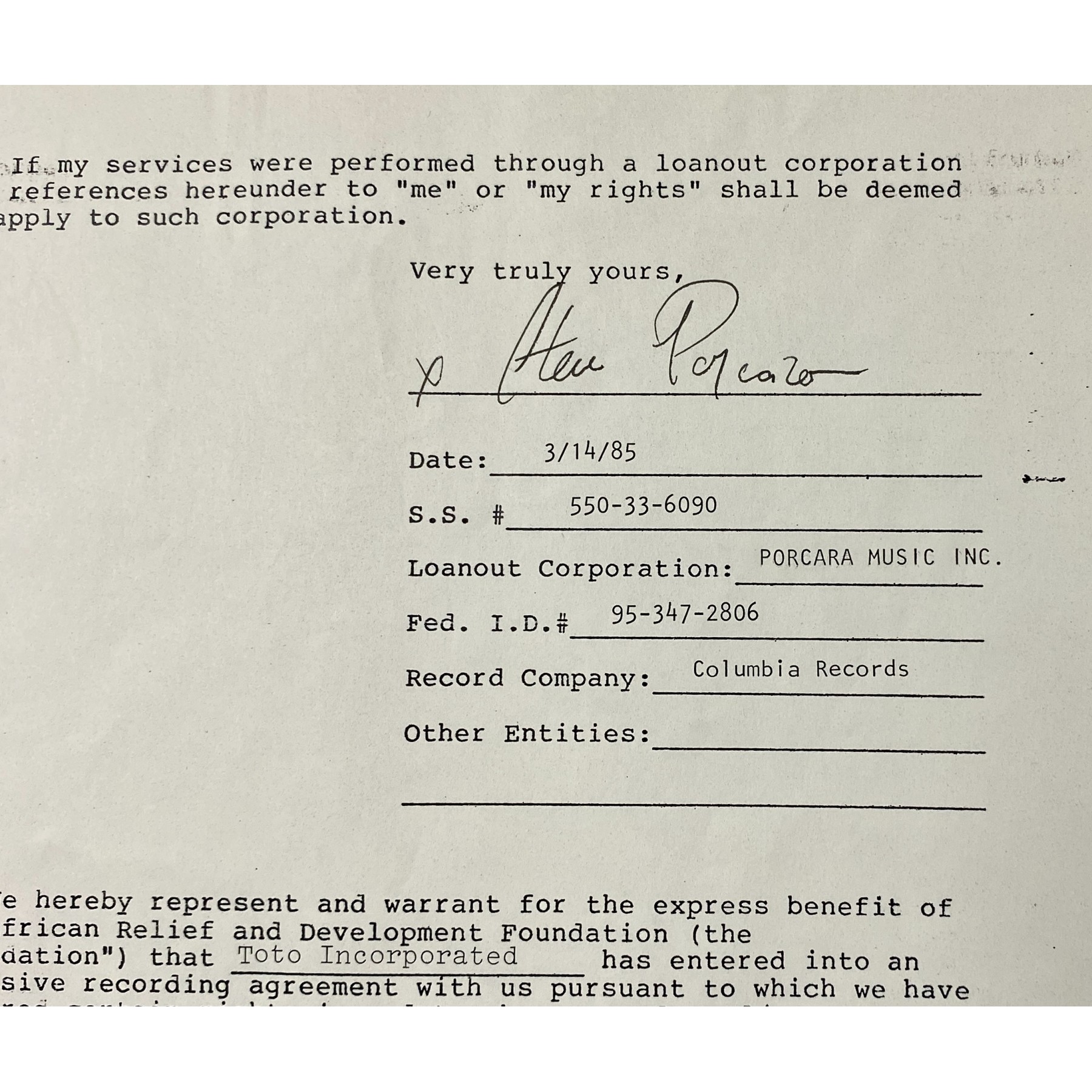 Item #0559 Alan Porcaro (Toto) Signed We Are The World Contract + Vinyl Album – PSA LOA