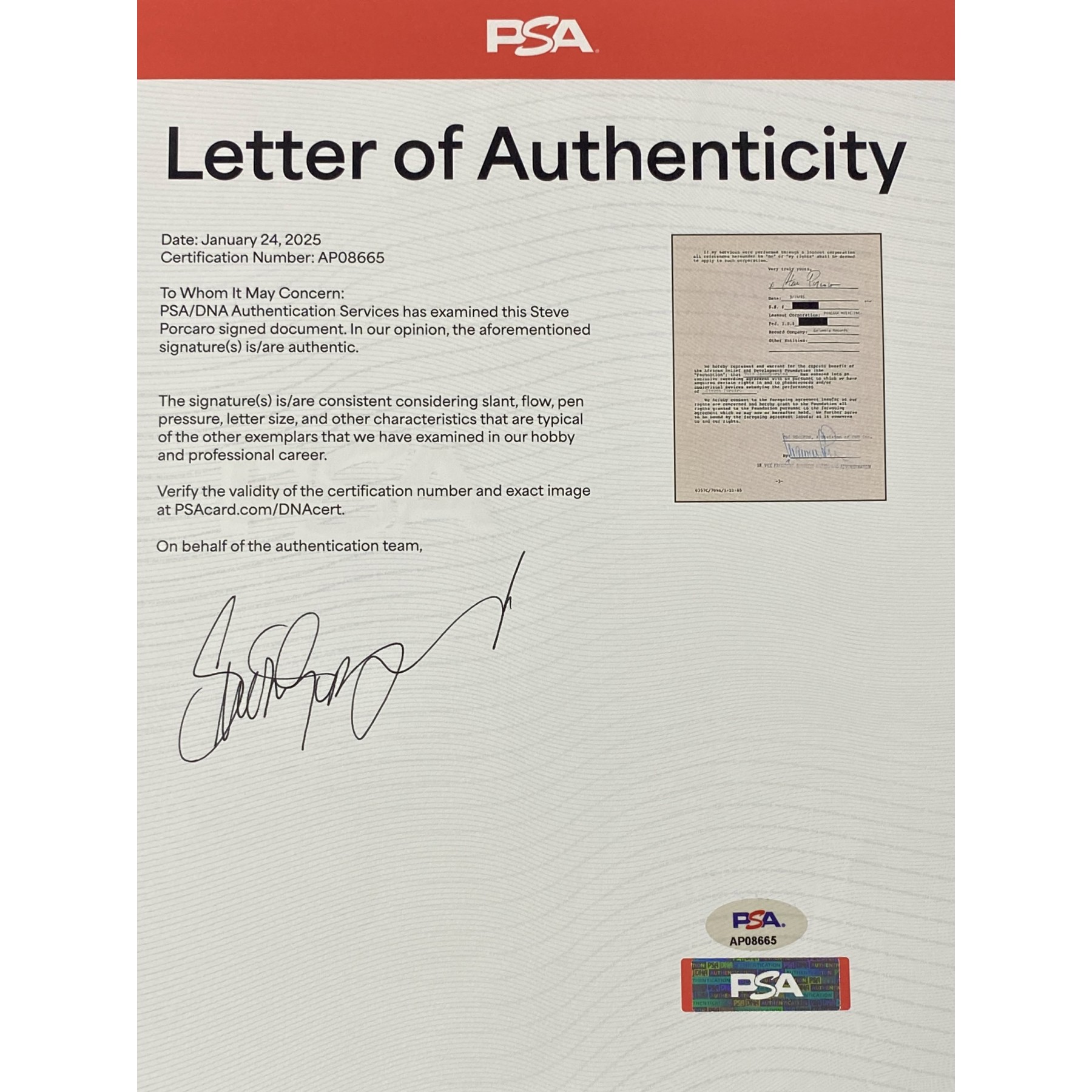 This original three-page We Are The World contract is hand-signed with black ink pen by musician Alan Porcaro, & accompanied by a vinyl copy of the legendary 1985 charity album. Comes complete with a PSA Letter of Authenticity. Porcaro, part of the renowned musical Porcaro family and founding member of the band Toto, contributed his synthesizer talents to the historic recording that united the era’s top artists for humanitarian relief. A meaningful collectible linking an acclaimed musician to one of the most celebrated collaborations in music history.