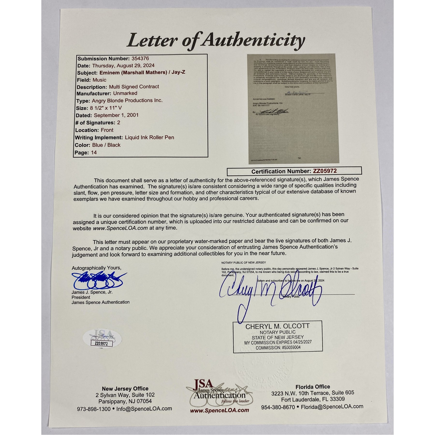 Item #0572 Jay Z & Eminem Dual-Signed "Renegade" Contract – Rare Full-Name Eminem Signature – JSA