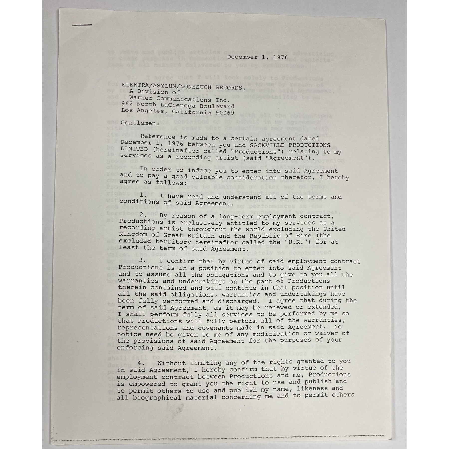 This rare 3-page, 8.5" x 11" agreement dated December 1, 1976, between Queen and Elektra/Asylum/Nonesuch Records grants the label exclusive rights to the band’s performances outside the UK. The final page bears bold black & blue ink pen signatures from all four members: Freddie Mercury, Brian May, Roger Taylor, and John Deacon. Signed just weeks before launching their A Day at the Races tour - featuring the live debuts of “Somebody to Love” and “Bohemian Rhapsody” - this contract comes from a pinnacle year in which Queen enjoyed a #1 album (A Night at the Opera) and a #1 single (“Bohemian Rhapsody”) in the United Kingdom. Includes a full PSA Letter of Authenticity with a PSA 9 autograph grade.