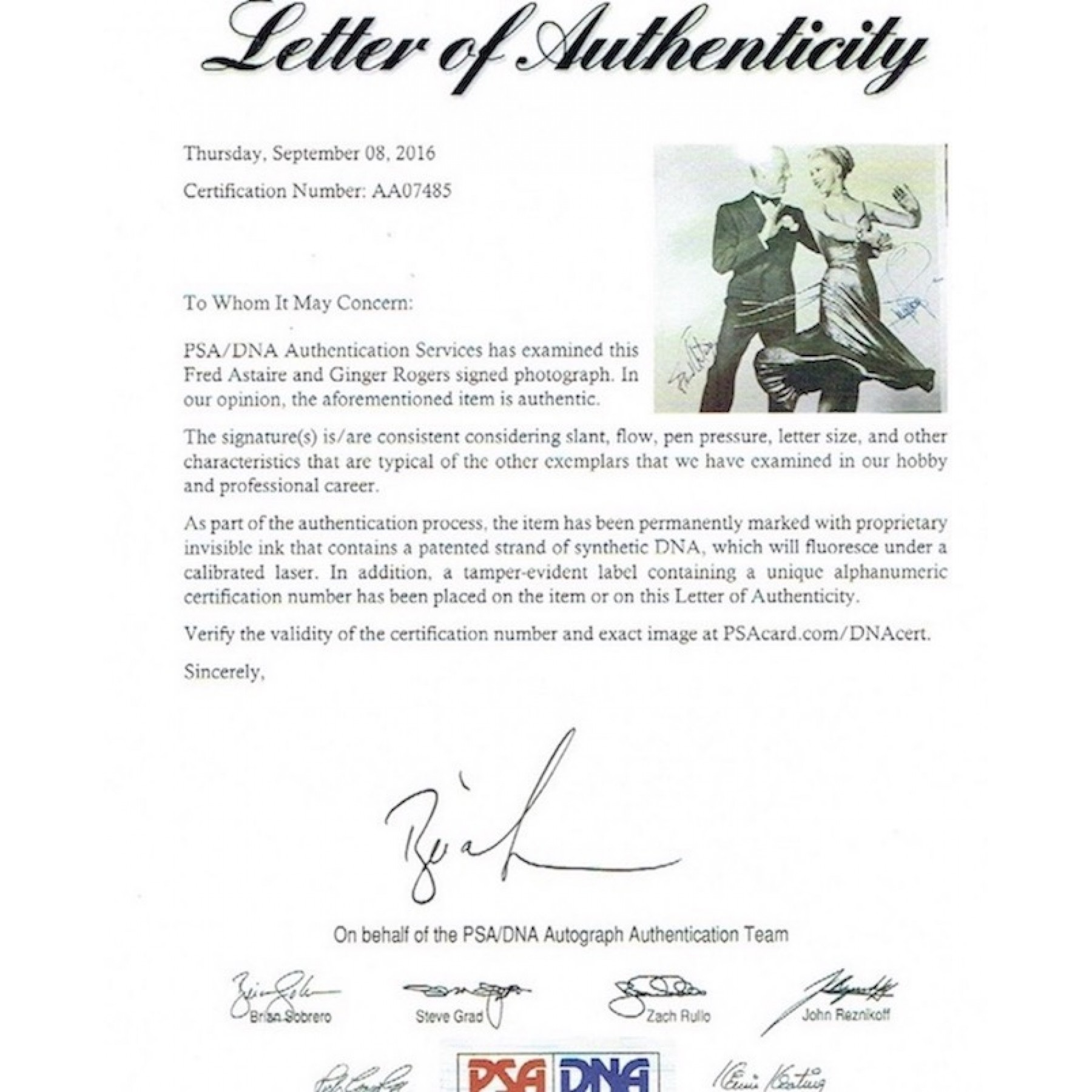 This classic vintage 8" x 10" movie promotional photo is signed boldly by the No. 1 dance duo in Hollywood History: Fred Astaire & Ginger Rogers. Comes complete with a Letter of Authenticity from PSA/DNA.