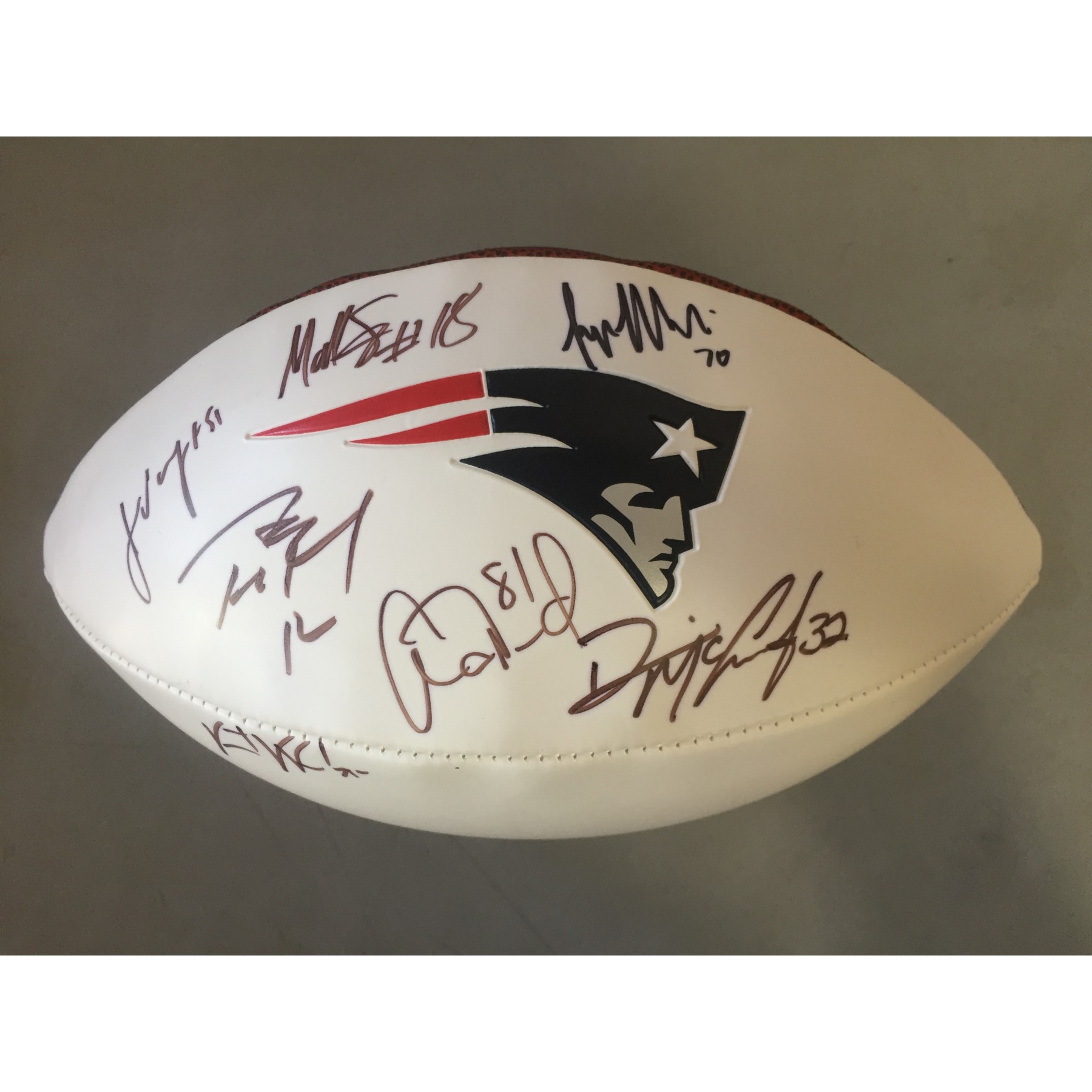 This New England Patriots panel ball is signed by all 7 captains of the 2012 team, including: Tom Brady, Aaron Hernandez, Jerod Mayo, Vince Wilfork, Matthew Slater, Logan Mankins, and Devin McCourtney. Any team signed football that includes the notorious deceased Aaron Hernandez is extremely rare. The New England patriots won the NFL Championship a total of 6 times so far and is famous for the most Super Bowl victories in NFL history.
