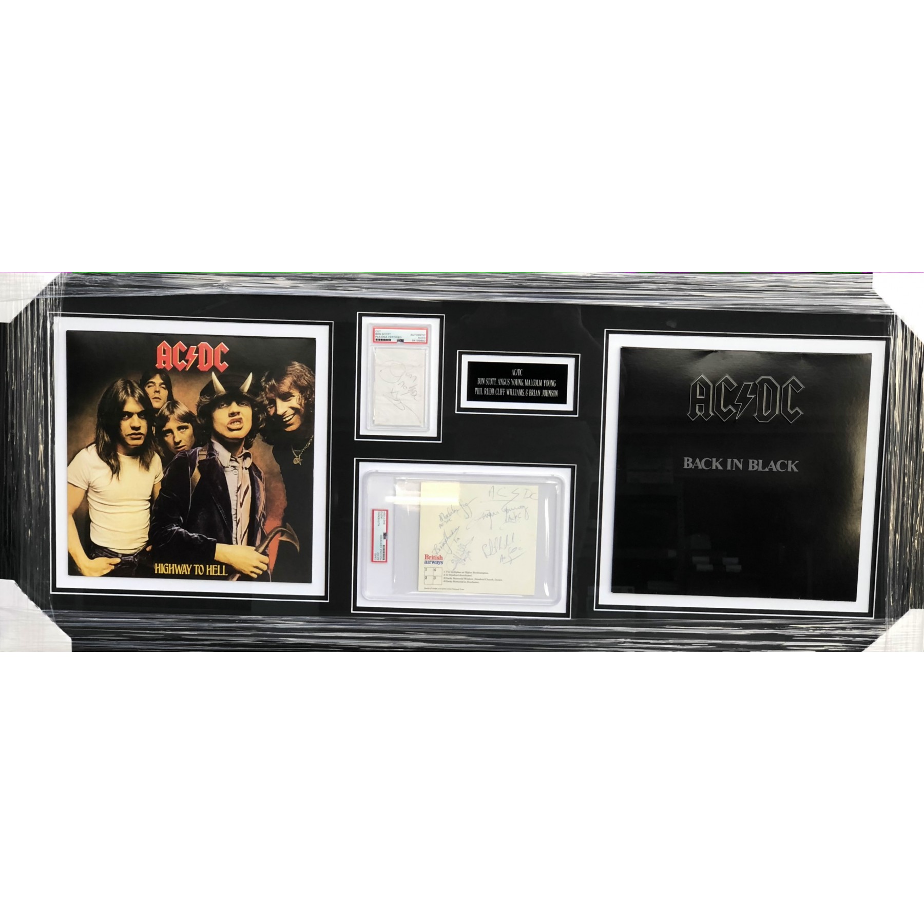 Beautifully framed classic AC/DC album covers "Highway to Hell" and "Back in Black." Complete with PSA/DNA encapsulated signatures of the late, great AC/DC lead singer, Bon Scott, who was featured on "Highway to Hell" and all AC/DC albums prior to that, then another PSA/DNA encapsulated autograph page featuring the rest of the band including Angus Young, Malcom Young, Phil Rudd, Cliff Williams, and their new lead singer, Brian Johnson, who sang lead on all albums from "Back in Black" moving forward. This complete AC/DC band signed collection is a must-have for any true fan of this iconic band.