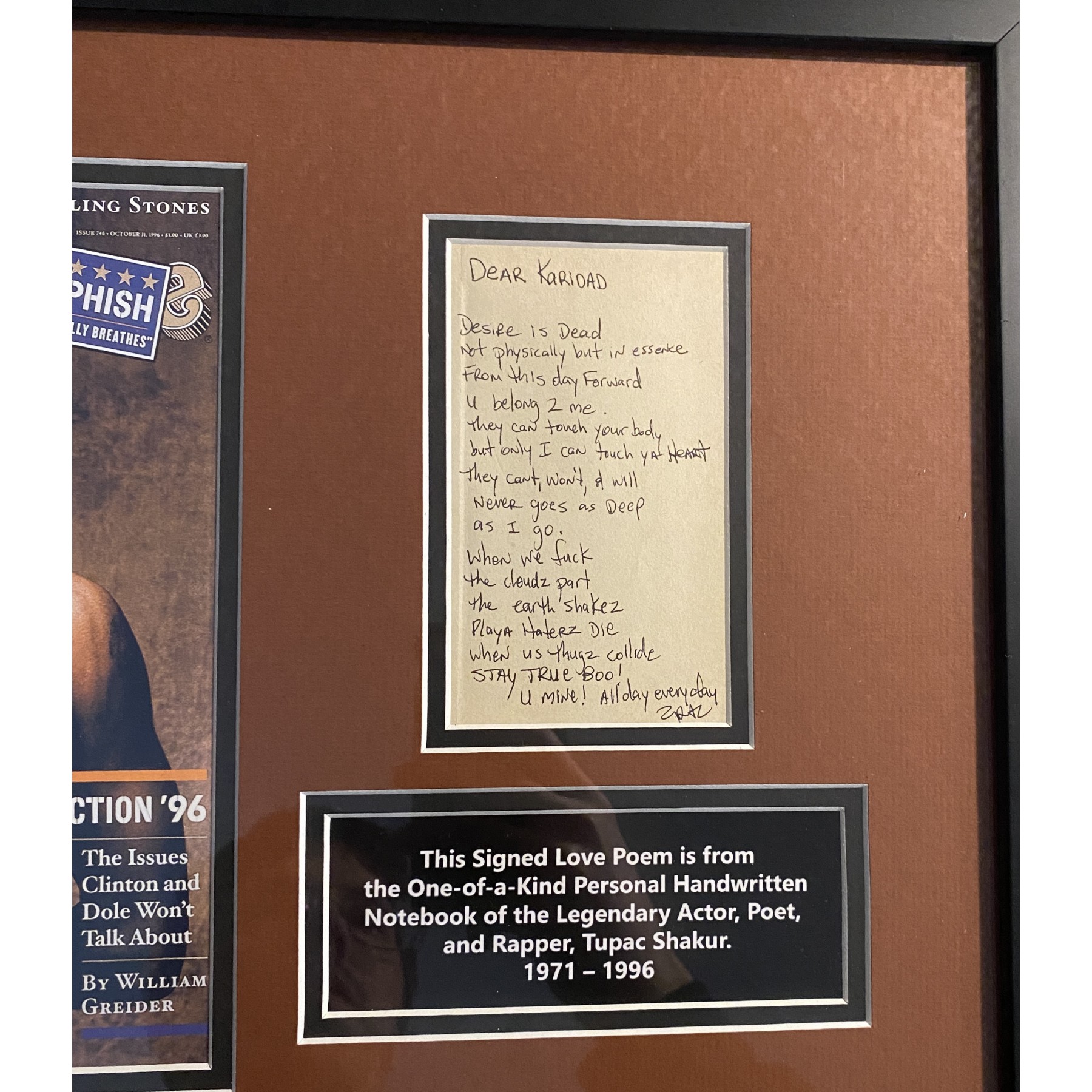 This signed Love Poem is from the one-of-a-kind Personal Notebook of the Late Legendary Actor, Poet, and Rapper, Tupac Shakur written to his girlfriend, Karidad to declare his eternal love. Sadly, Tupac didn't live long enough share all that love, due to the fact that he was assassinated on September 7th, 1996, more than 25 years ago. However, his legacy seems to only grow with time.