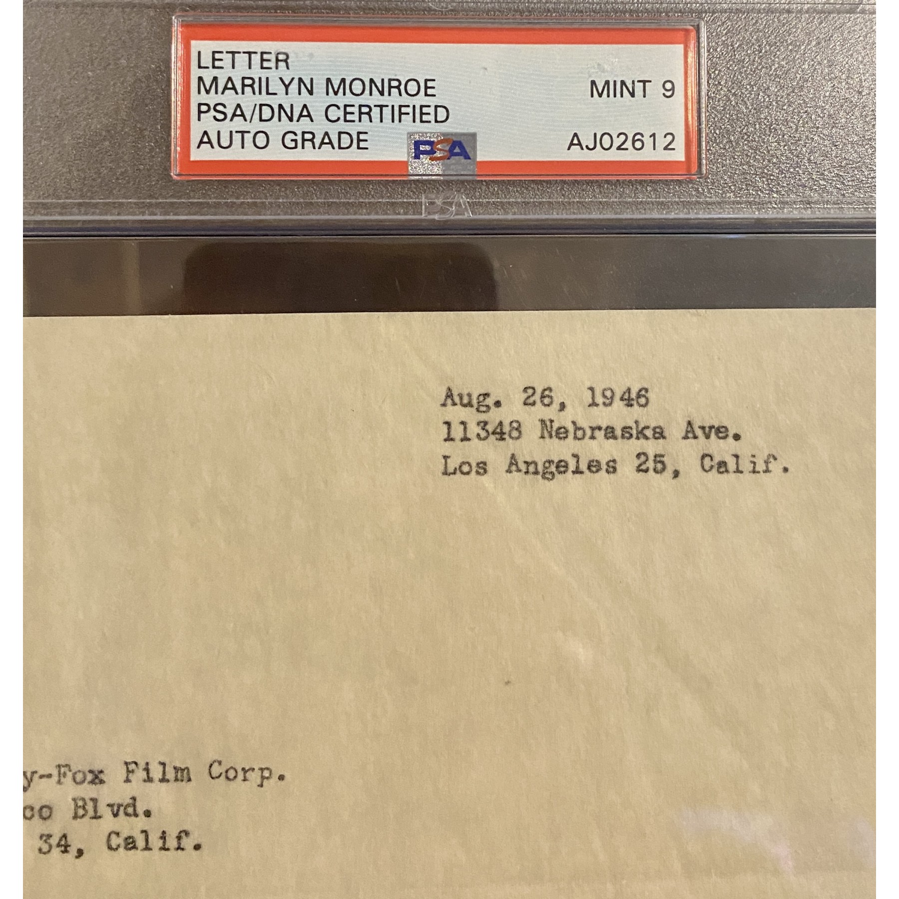 In 1946, Marilyn Monroe was a fresh-faced 20 year old hopeful starlet who signed her very first contract with 20th Century Fox in July of that year. A few weeks later, on August 26th, 1946, Marilyn signed this document boldly with her full, legal name Norma Jean Dougherty. This document is addressed to 20th Century Fox, discussing payment authorization from her first Hollywood contract to her agency, & captures an early, pivotal moment just before her rise to Hollywood stardom as Marilyn Monroe. Encapsulated with a signature grade of Mint 9 by PSA/DNA, which also includes their Letter of Authenticity.