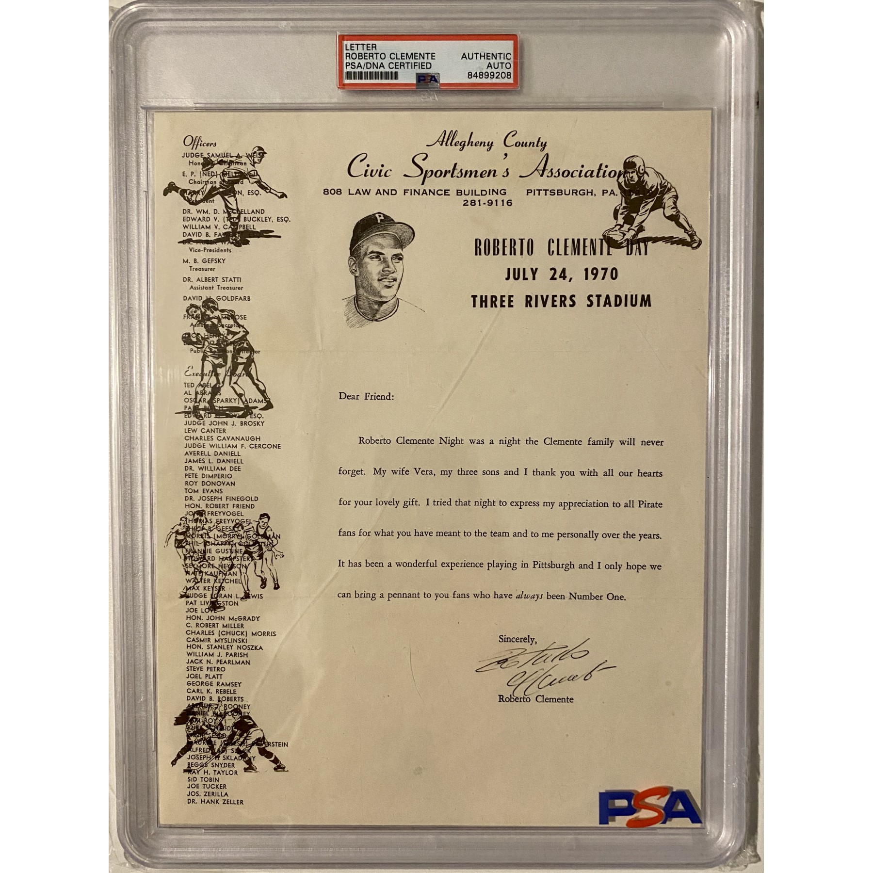 This 1970 letter signed by Roberto Clemente, on Allegheny County Civic Sportsmen's Association letterhead, warmly expresses his gratitude for a gift received on Roberto Clemente Day, highlighting what it meant to him and his family. Clemente, a Hall of Famer, was known not only for his extraordinary skills on the field but also for his humanitarian efforts. Encapsulated and accompanied by a PSA Letter of Authenticity, this piece captures the spirit of one of baseball’s most beloved figures.
