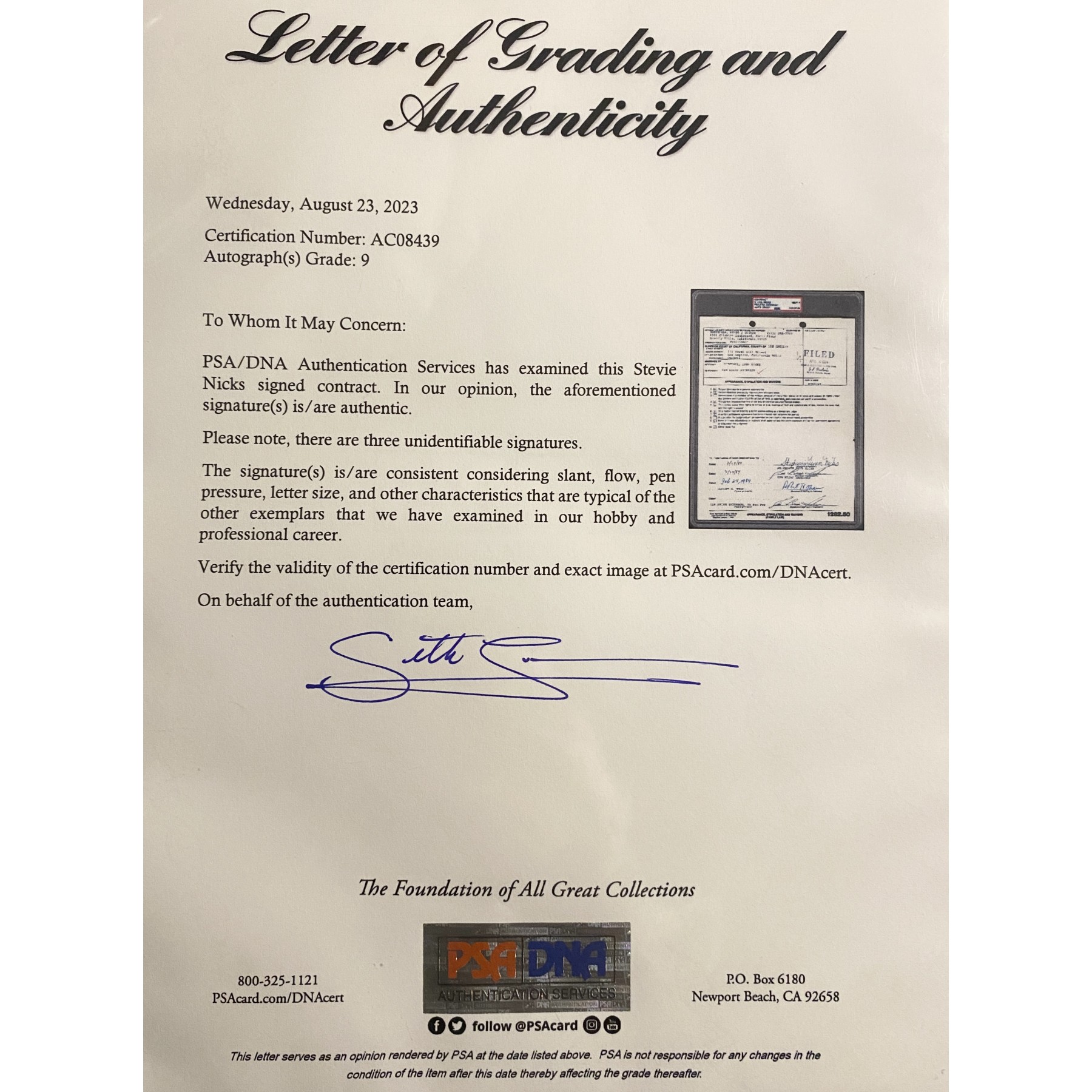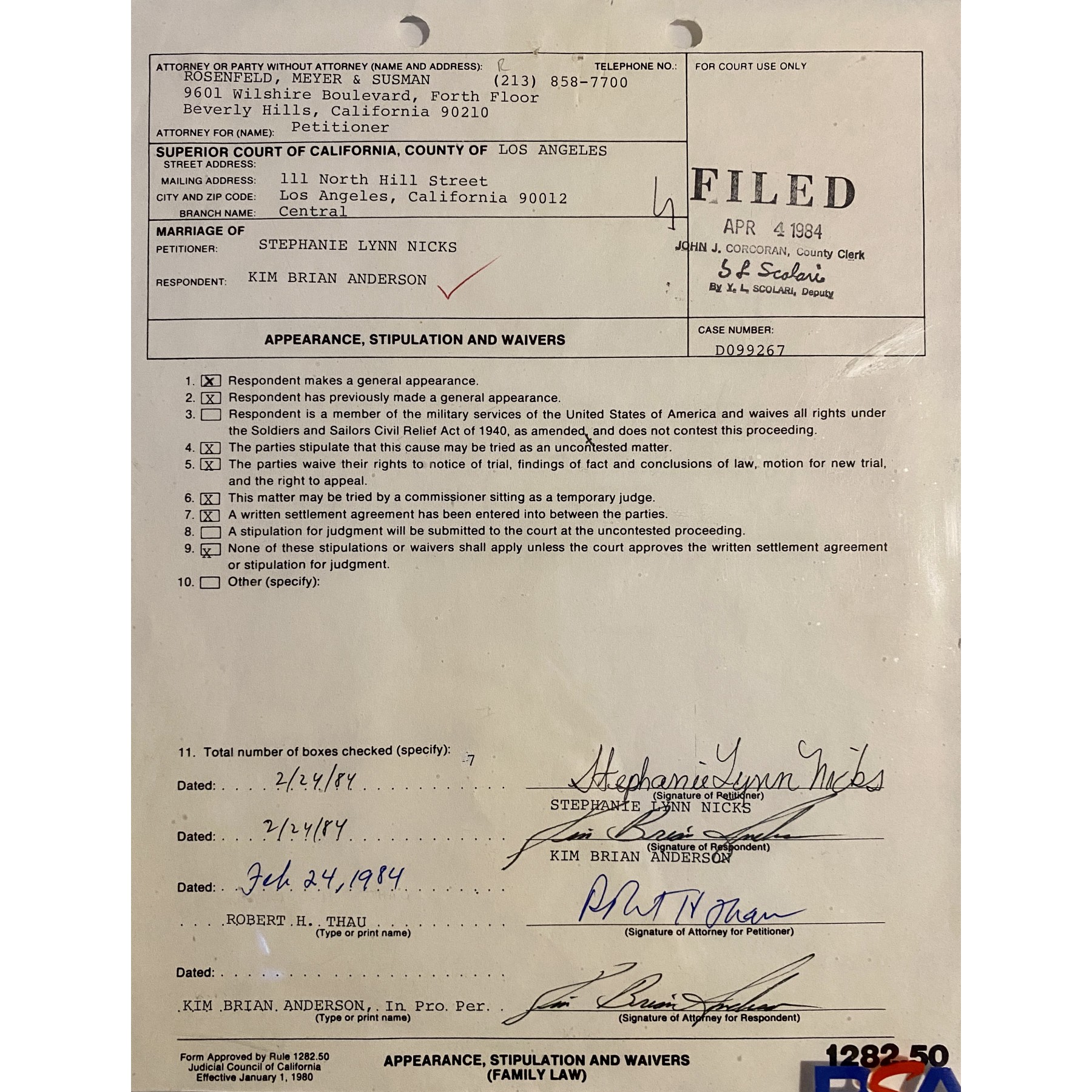 Item #0383 Stevie Nicks Signed Divorce Court Document - Auto Grade Mint 9 - PSA/DNA SOLD