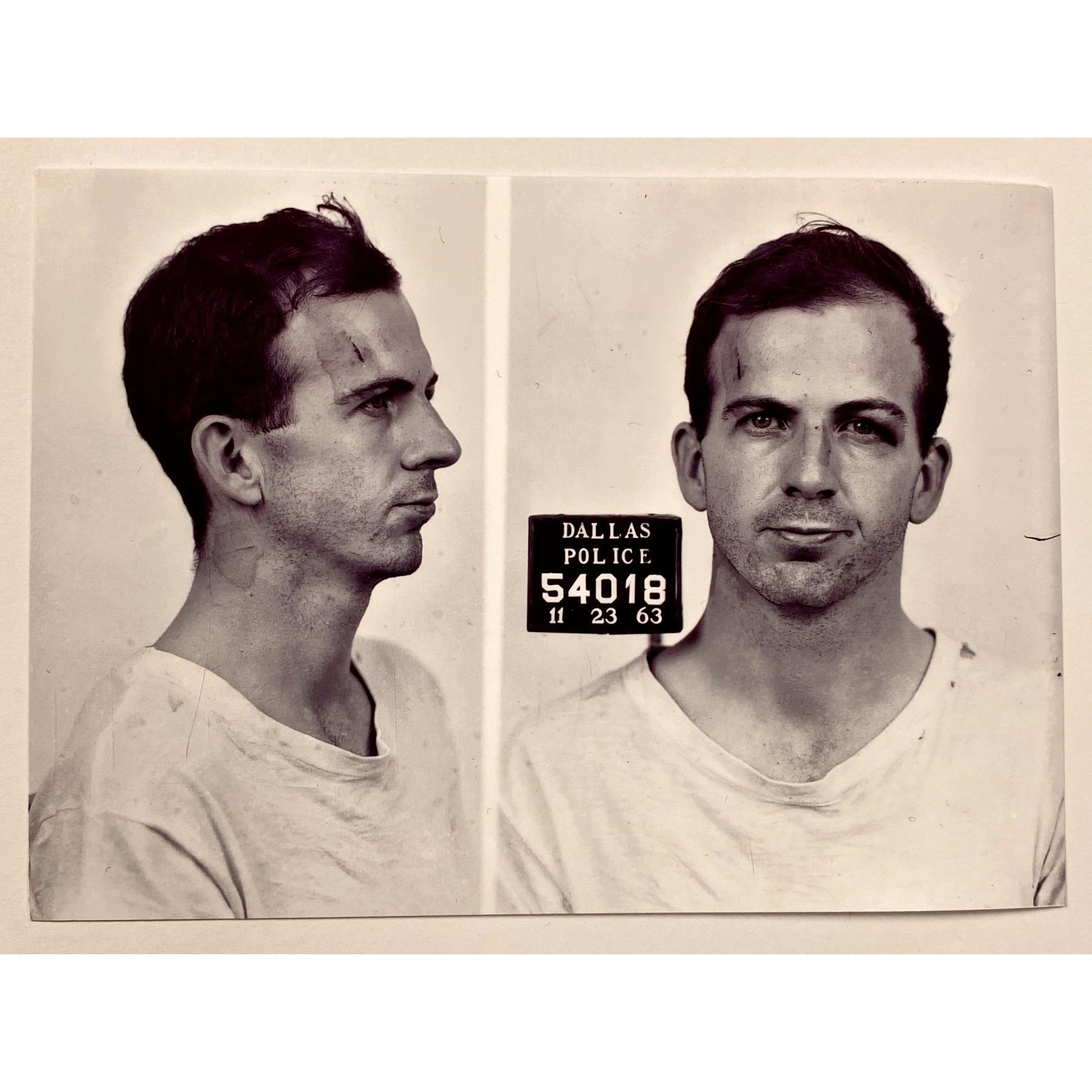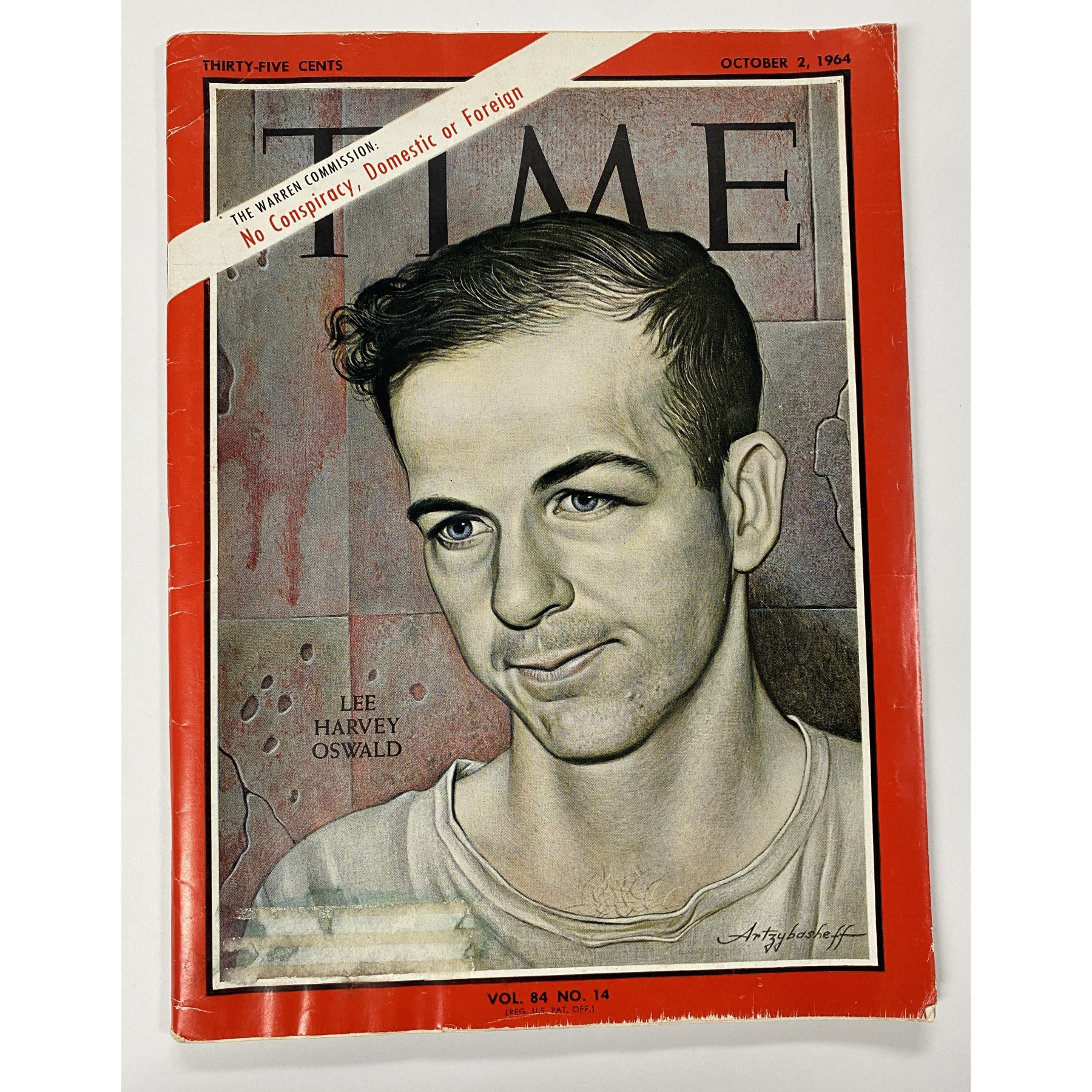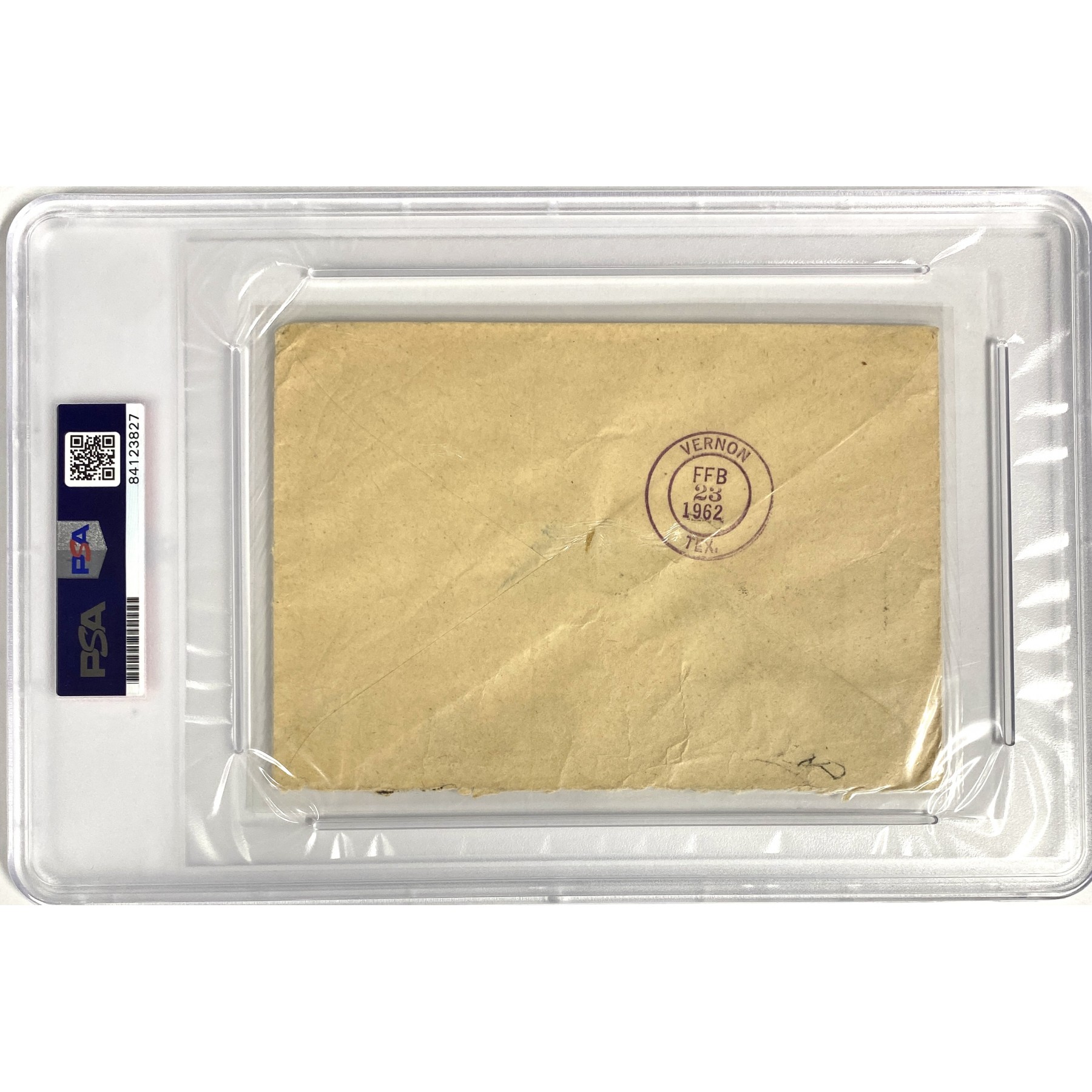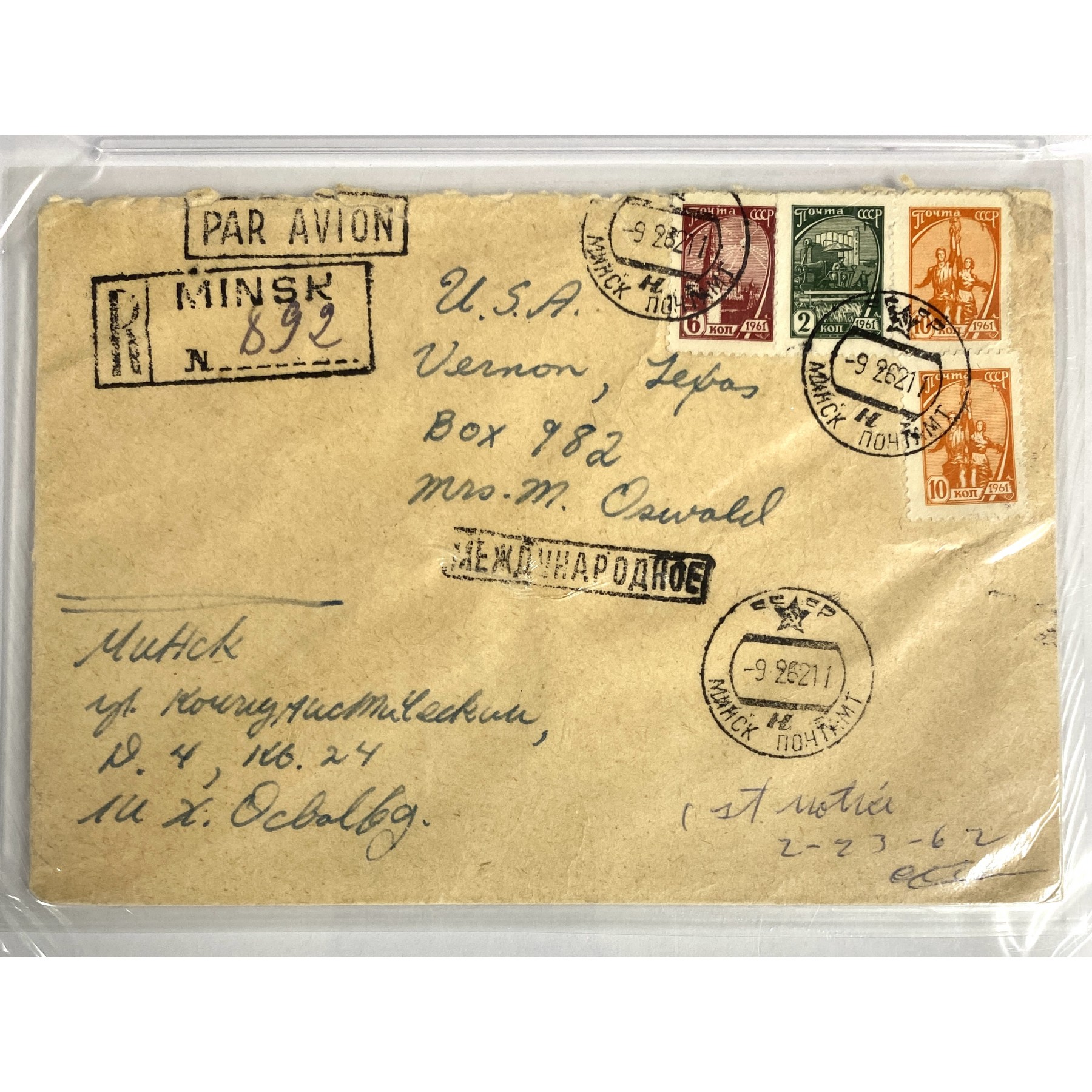 This hand-written air mail envelope is addressed by Lee Harvey Oswald, who assassinated President John F. Kennedy on November 22, 1963, to his mother, "U.S.A., Vernon, Texas, Box 982, Mrs. M. Oswald,” adding his Minsk return address and name in Russian to the lower left. The envelope bears Russian postmarks on the front, and a February 23, 1962, Vernon, Texas postmark on the reverse. The envelope bears soft lamination, consistent with other official exhibits that were in the government's possession during the Warren Commission investigation. PSA Encapsulated with a grading of the handwriting as PSA MINT 9. Accompanied by an issue of Time magazine from October 2, 1964.